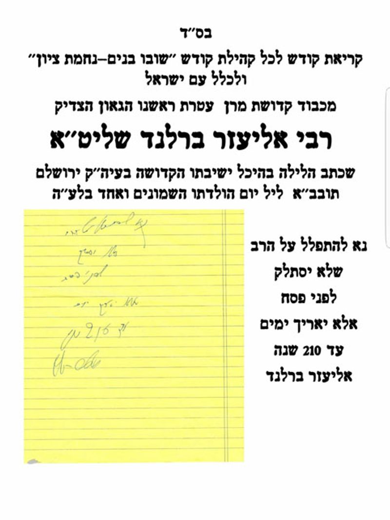למעשה, כבר ביום ההולדת של הרב שליט"א הוא כתב מכתב ובו ביקש בדחיפות להתפלל עליו לרפואה. זה תוכן התפילה – "נא להתפלל על הרב שלא יסתלק לפני פסח אלא יאריך ימים עד 210 שנים".