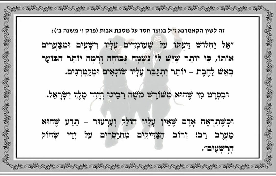 "אל יחליש דעתו על שעומדים עליו רשעים ומצערים אותו, כי יותר שיש לו נשמה גבוהה ורמה יותר הבוער באש להבה - יותר מתגבר עליו שונאים ומקטרגים. ובפרט מי שהוא משורש משה רבינו ודוד מלך ישראל. וכשתראה אדם שאין עליו מחלוקת וערעור - תדע שהוא מערב רב! ורוב הצדיקים מתיסרים על ידי צחוק הרשעים." עד כאן לשונו