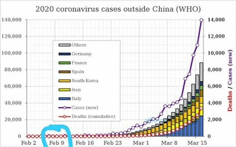 עקומה המראה כי התפשטות הקורונה בעולם הייתה הרבה אחרי שהרב ברלנד הזהיר מהתפשטותה