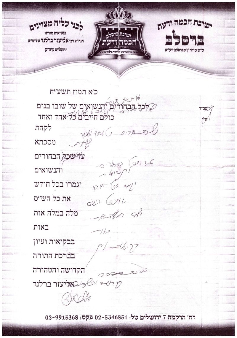 מכתב של הגה"צ הרב אליעזר ברלנד שליט"א לשומעי דבריו