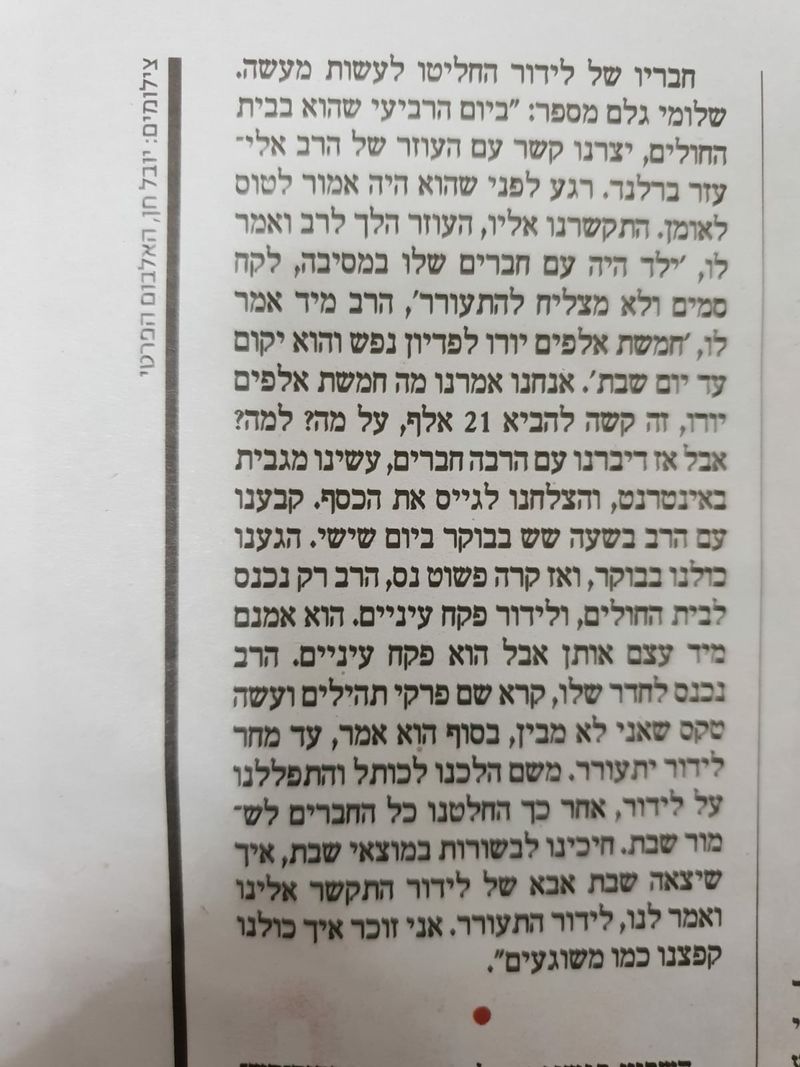 "אנחנו אמרנו מה חמשת אלפים יורו, זה קשה להביא 21 אלף, על מה? למה? אבל אז דיברנו עם הרבה חברים, עשינו מגבית באינטרנט, והצלחנו לגייס את הכסף. קבענו עם הרב בשעה שש בבוקר ביום שישי. הגענו בבוקר, ואז קרה פשוט נס, הרב רק נכנס לבית החולים, ולידור פקח עיניים. הרב נכנס לחדר שלו, קרא שם פרקי תהלים ועשה טקס שאני לא מבין, בסוף הוא אמר, עד מחר לידור יתעורר. במוצאי שבת אבא של לידור התקשר אלינו ואמר לנו, לידור התעורר. אני זוכר איך כולנו קפצנו כמו משוגעים".