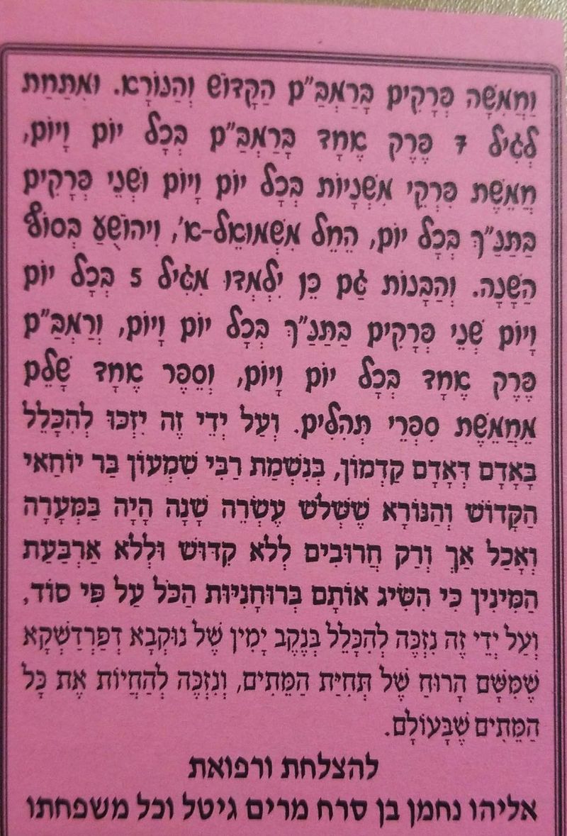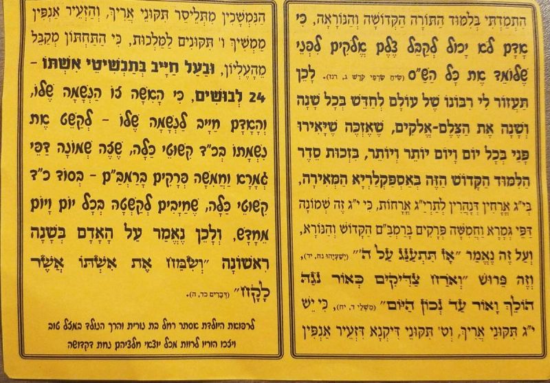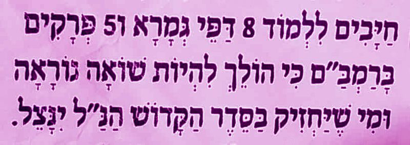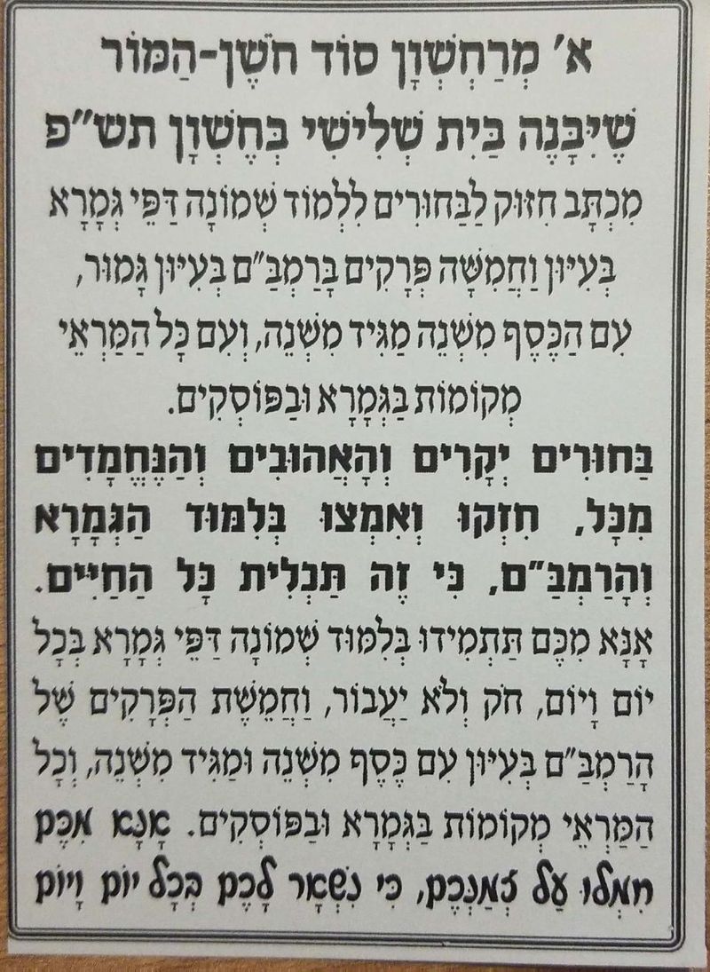 "חייבים ללמוד 8 דפי גמרא ו - 5 פרקים ברמב"ם, כי הולכת להיות שואה נוראה, ומי שיחזיק בסדר הקדוש הנ"ל ינצל.