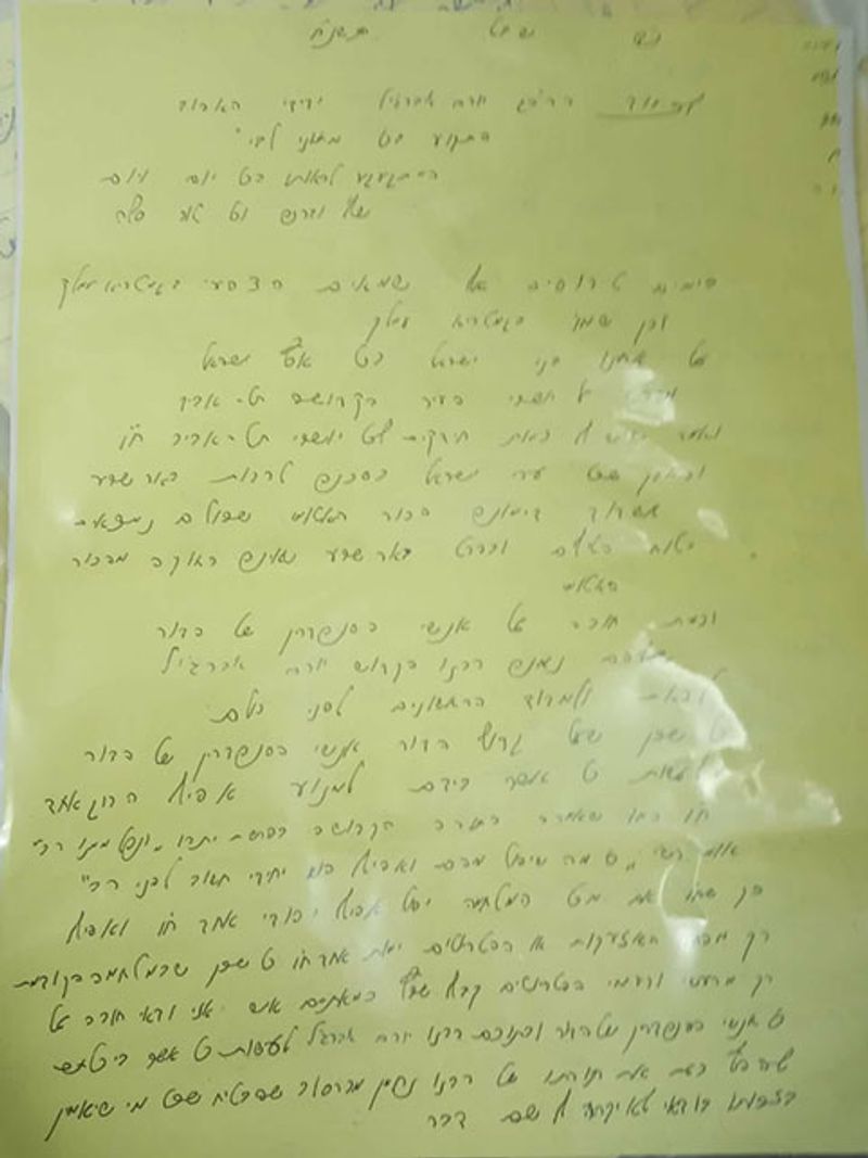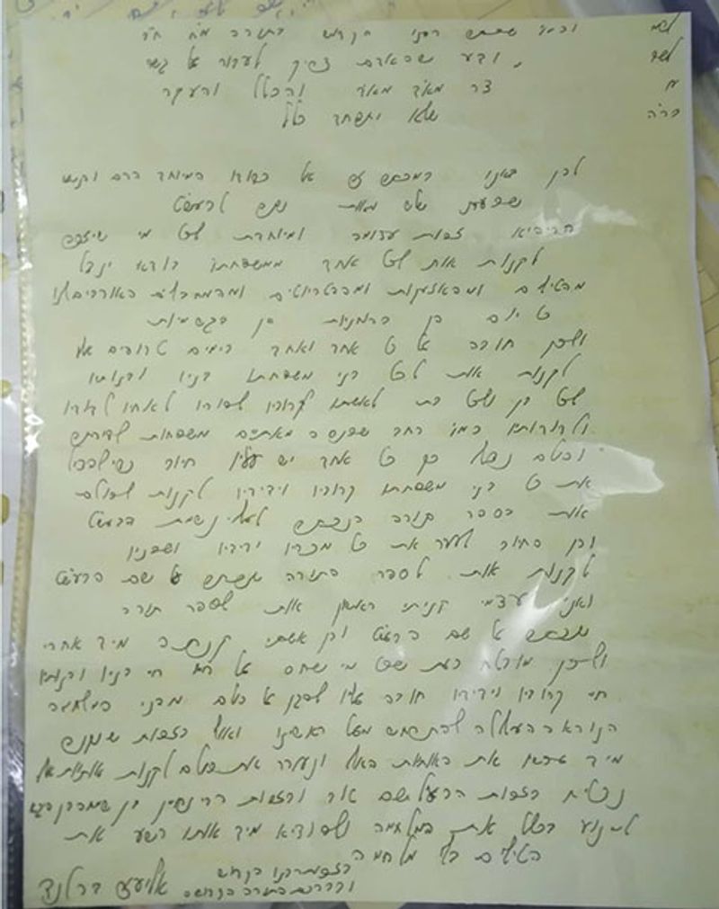 העותק המקורי של מכתב הגה"צ הרב אליעזר ברלנד שליט"א אל הגה"צ הרב יורם אברג'ל זצ"ל