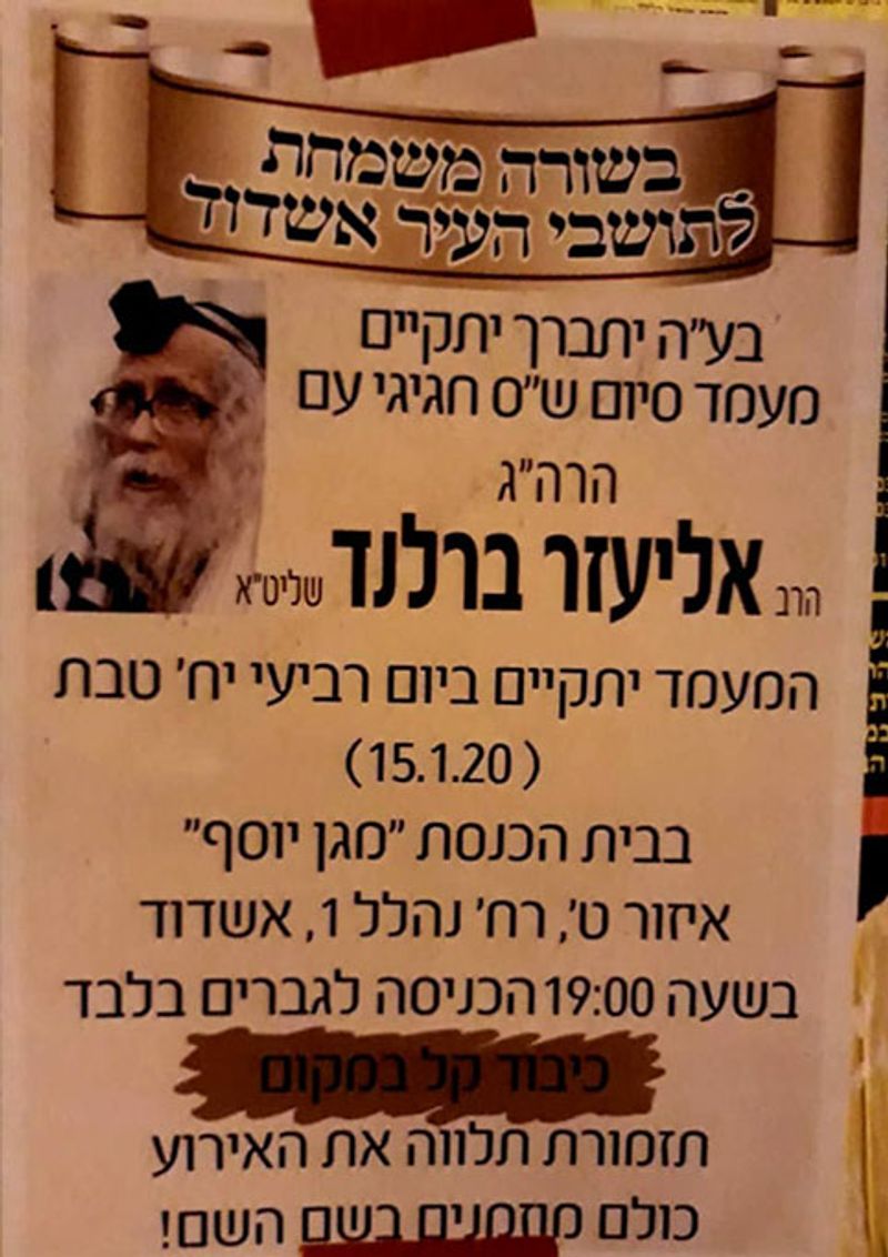 היום, הלילה שבן רביעי לחמישי בשבת שמות תש"פ, הגיע מורינו, כ"ק הגה"צ הרב אליעזר ברלנד שליט"א, לעיר לאשדוד לכנס התורני ולמעמד סיום הש"ס. הכנס נערך בביה"כ 'מגן יוסף', שברח' נהלל, לפני קהל גדול. רבים המתינו לבואו של מורינו הרב ברלנד שליט"א, שמסר את דברי קודשו בהתלהבות וקדושה מעוררת לבבות.