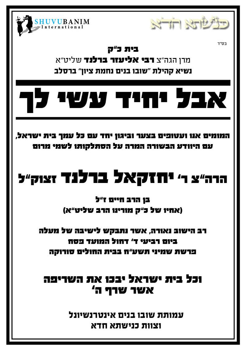 בית כ"ק מרן הגה"צ הרב אליעזר ברלנד שליט"א, נשיא קהילת "שובו בנים נחמת ציון" ברסלב - אבל יחיד עשי לך. המומים אנו ועטופים בצער וביגון יחד עם כל עמך בית ישראל עם היוודע הבשורה על הסתלקותו לשמי מרום של הרה"צ רבי יחזקאל ברלנד זצ"ל, בן הרב חיים ז"ל ואחיו של כ"ק מורינו הרב שליט"א, רב הישוב נאורה אשר נתבקש לישיבה של מעלה ביום ד' דחול המועד פסח. וכל בית ישראל יבכו את השריפה אשר שרף ה'. ת.נ.צ.ב.ה