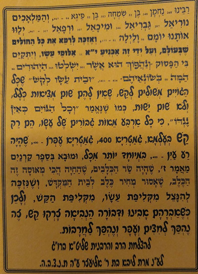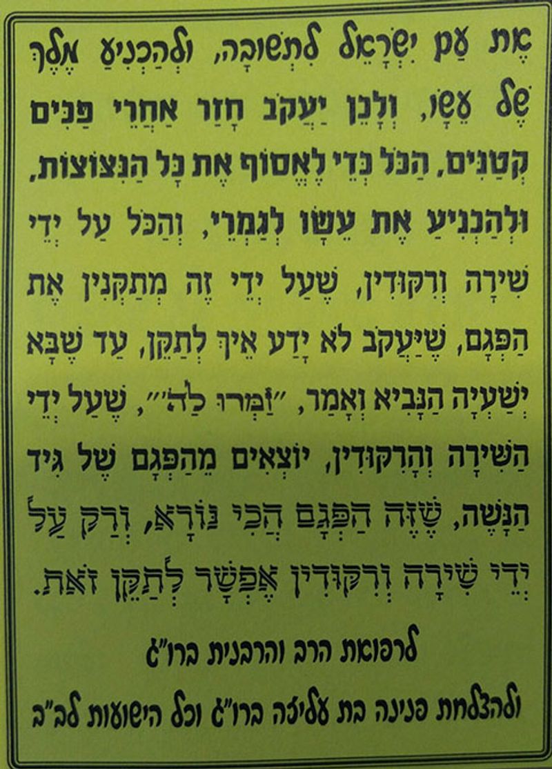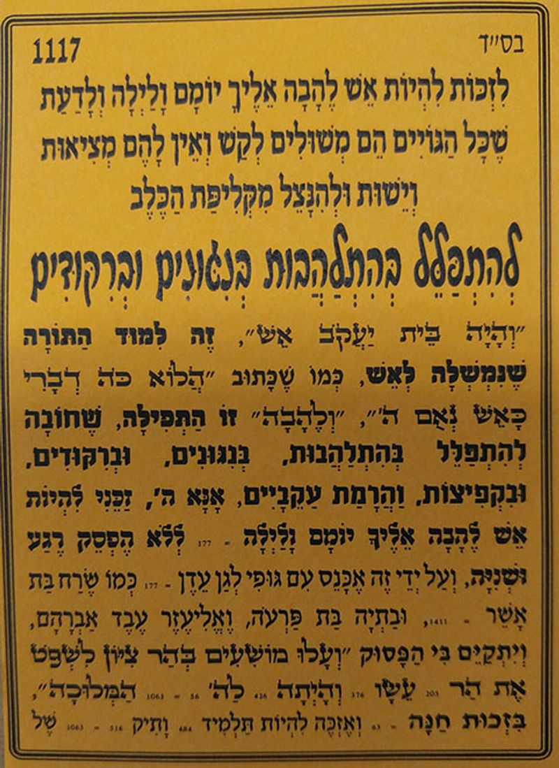 תפילה להתפלל בהתלהבות בניגונים ובריקודים - לזכות להיות אש להבה אליך יומם ולילה, ולדעת שכל הגויים משולים לקש, ואין להם מציאות וישות, ולהינצל מקליפת כלב