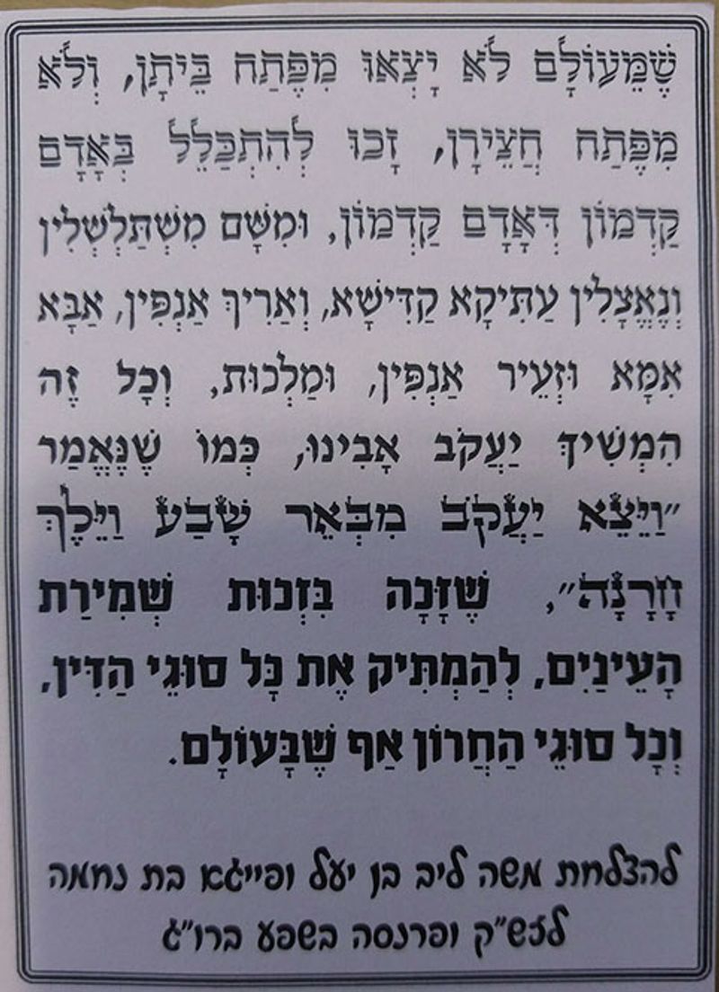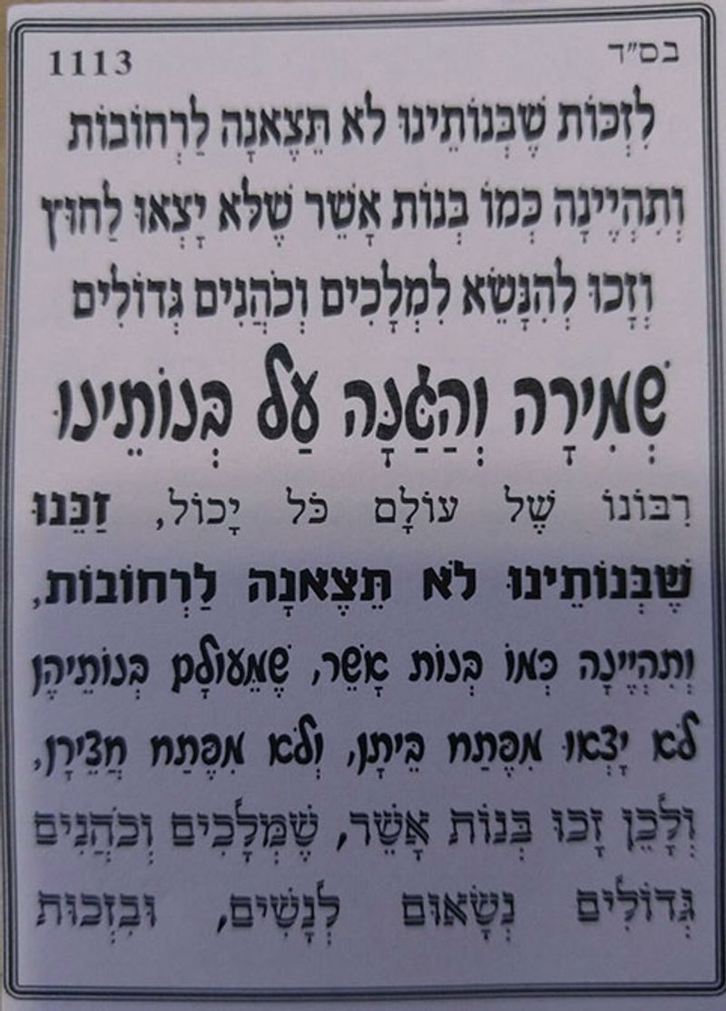תפילה לשמירה והגנה על בנותינו - לזכות שבנותינו לא תצאנה לרחובות ותהיינה כמו בנות אשר שלא יצאו לחוץ וזכו להנשא למלכים וכהנים גדולים