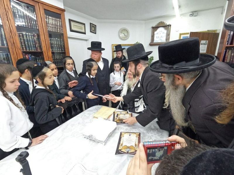 לאחר השירה המיוחדת הילדים הנרגשים עברו אחד אחד, וקבלו את התעודה המיוחדת מידיו הקדושות של מורינו הרב. כשלצידו של מורינו הרב עומדים - מפקח החיידר הר' בוקרצקי הי"ו והמלמדים הר' הלטובסקי הי"ו והר' מנדלסון הי"ו.