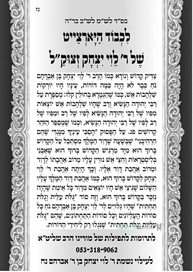 "צַדִּיק קָדוֹשׁ וְנוֹרָא כְּמוֹ הָרַב ר' לֵוִי יִצְחָק בֶּן אַבְרָהָם נֹחַ כְּבָר לֹא הָיָה כַּמָּה דּוֹרוֹת"