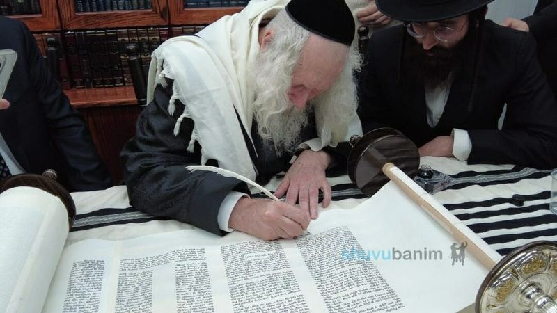 סיום כתיבת האותיות: בשעה 18:00 הגיעו תורמי ספר התורה יחד עם הרה"ח הרב אליהו מירב שליט"א שהוא זה שזכה לקרבם אל האור הגדול וזכה להכיר להם את מורינו הרב שליט"א - נכנסו יחדיו אל הקודש פנימה לסיום כתיבת האותיות על ידי מורינו הגה"צ רבי אליעזר ברלנד שליט"א שכתב את האות האחרונה שב"לעיני כל ישראל". לאחר סיום כתיבת האותיות אמר כי עכשיו זה ממש נחשב שקיבלנו את התורה מחדש, ובירך את התורמים שיזכו לכל טוב ושפע עד בלי די!