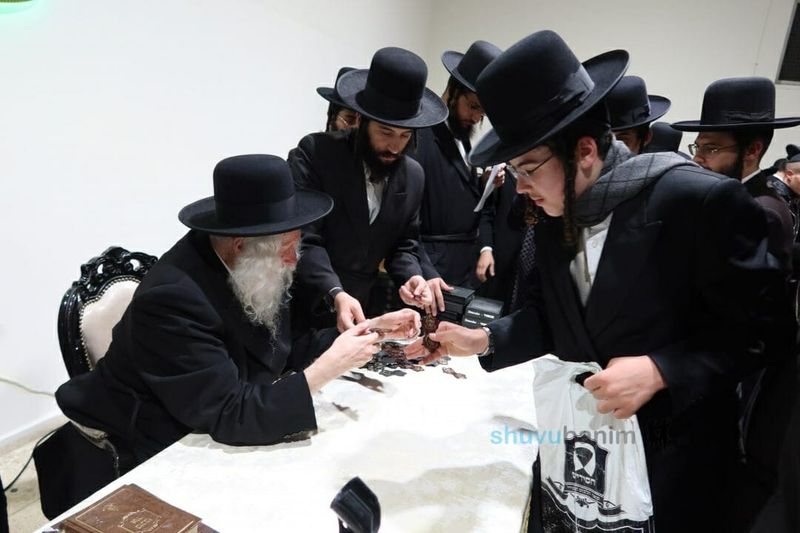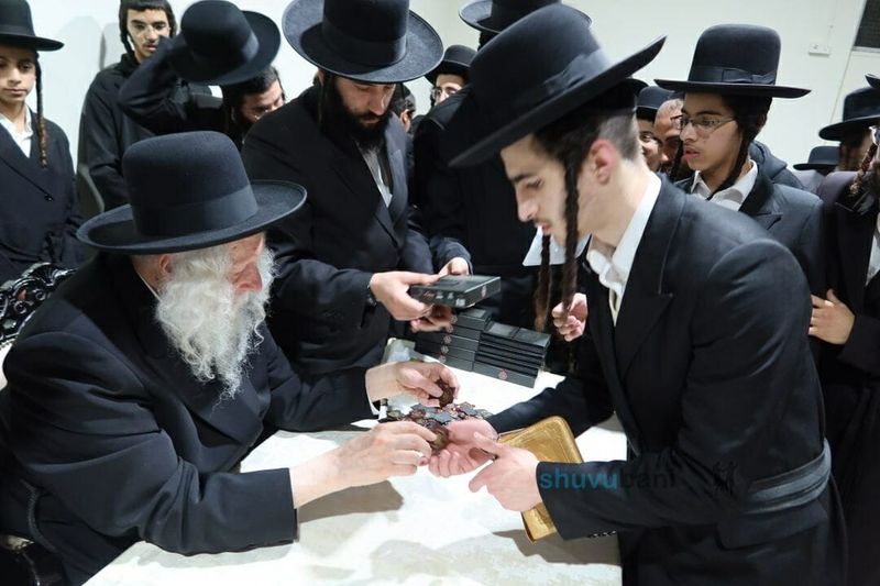 תוך כדי השירים והריקודים בחורי חבורת בני הנעורים עברו כל אחד וקיבלו מידיו הקדושות של מורינו הרב שליט"א 'חנוכה געלט' - מעות חנוכה מתנת חבורת בני הנעורים. לאחר סיום חלוקת המעות חנוכה למאות הבחורים מורינו הרב שליט"א יצא בשירה ובריקודים לעבר רכבו, וחזר לביתו נאווה קודש.