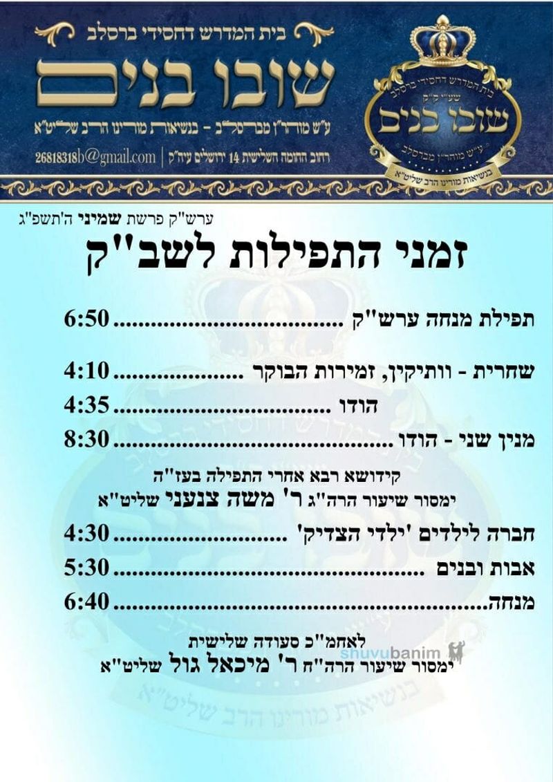 לפניכם זמני התפילות בבית מדרשינו לשבת פרשת שמיני: