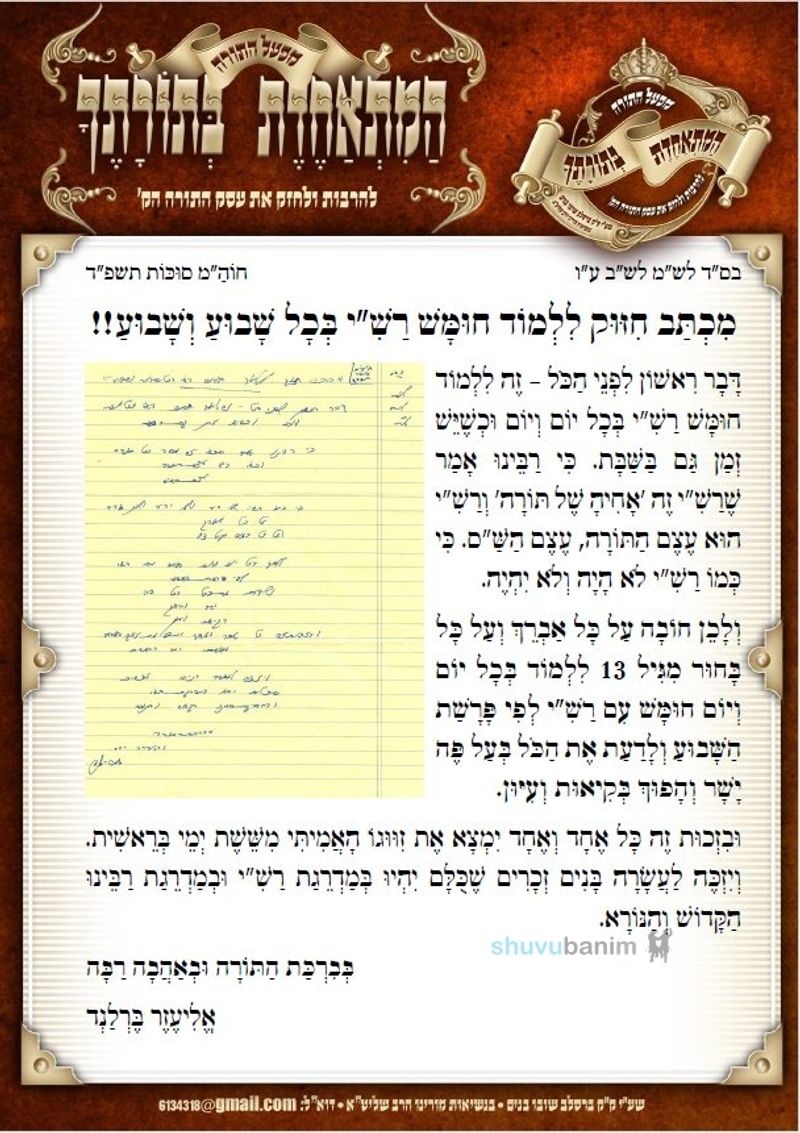 מִכְתַּב חִזּוּק לִלְמוֹד חוּמָּשׁ רַשִׁ"י בְּכָל שָׁבוּעַ וְשָׁבוּעַ!!