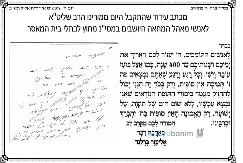 מכתב עידוד ממורינו, כ"ק הגה"צ הרב אליעזר ברלנד שליט"א, לאנשי המחאה היושבים במסירות נפש מחוץ לכותלי בית המאסר