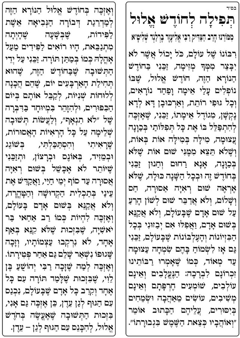 רִיבּוֹנוֹ שֶׁל עוֹלָם, כֹּל יָכוֹל אֲשֶׁר לֹא יִבָּצֵר מִמְּךָ מְזִימָּה, זַכֵּינִי בְּחוֹדֶשׁ אֱלוּל, שֶׁבּוֹ נוֹפְלִים עָלַי אֵימָה וּפַחַד נוֹרָאִים, וְכֹל גּוּפִי רוֹתֵת, וְאַרִכּוּבָן דָּא לְדָא נָקְשָׁן, מִגּוֹדֶל אֵימָתוֹ, זַכֵּינִי, שֶׁאֶזְכֶּה לְהִתְפַּלֵּל בּוֹ אֶת כָּל תְּפִילּוֹתַי בְּכַוָּנָה עֲצוּמָה, מִילָה בַּמִּילָה אוֹת בְּאוֹת, וְשֶׁלֹּא תֵּצֵא מִמֶּנִּי שׁוּם אוֹת שֶׁלֹּא בְּכַוָּנָה...