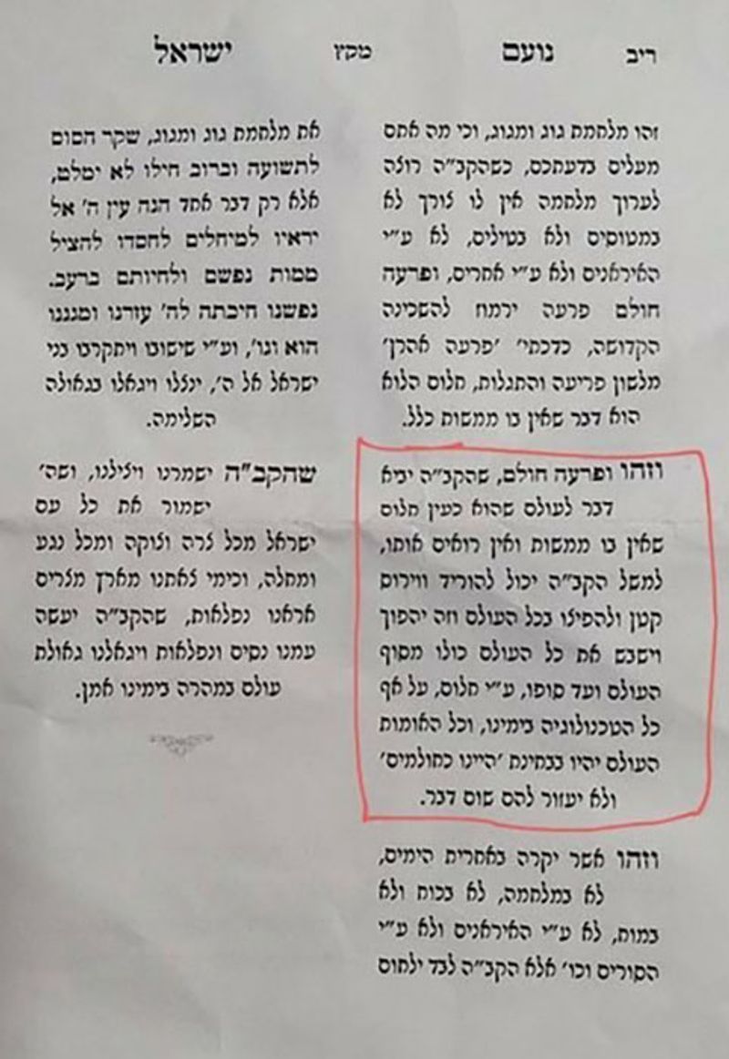 אלו דברי קודשו, "וזהו פרעה חולם, שהקדוש ברוך הוא יביא דבר לעולם שהוא כעין חלום שאין בו ממשות ואין רואים אותו, למשל הקדוש ברוך הוא יכול להוריד ווירוס קטן ולהפיצו בכל העולם וזה יהפוך וישבש את כל העולם כולו מסוף העולם ועד סופו, ע"י חלום, על אף כל הטכנולוגיה בימינו, וכל האומות העולם יהיו בבחינת 'היינו כחולמים' ולא יעזור להם שום דבר".