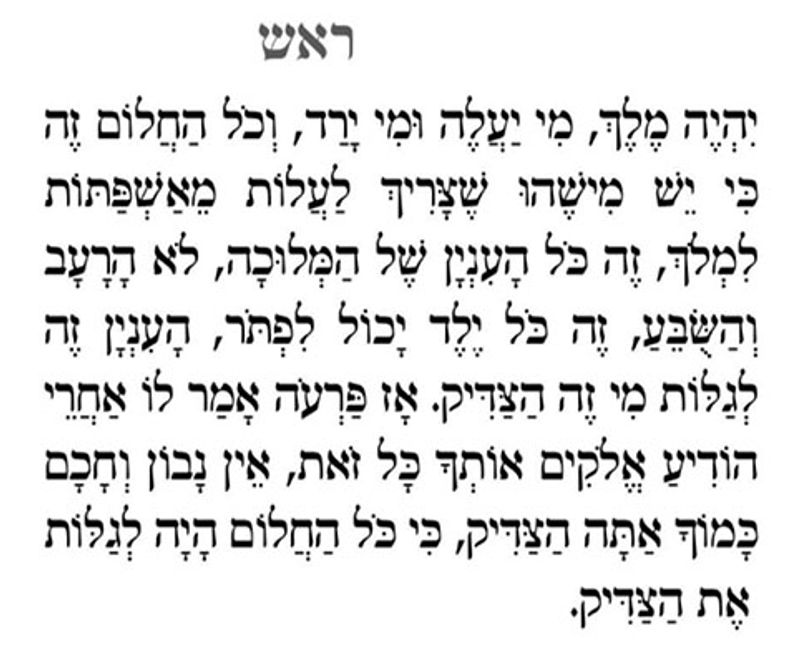 וזה מה שאמר מורנו הרב שליט״א בשביבי אור האחרון שעיקר הפתרון של החלום זה לא הפירוש של החלום אלא הפתרון זה לגלות את הצדיק ולעשות אותו מלך, אז ממילא הכל יסתדר.
