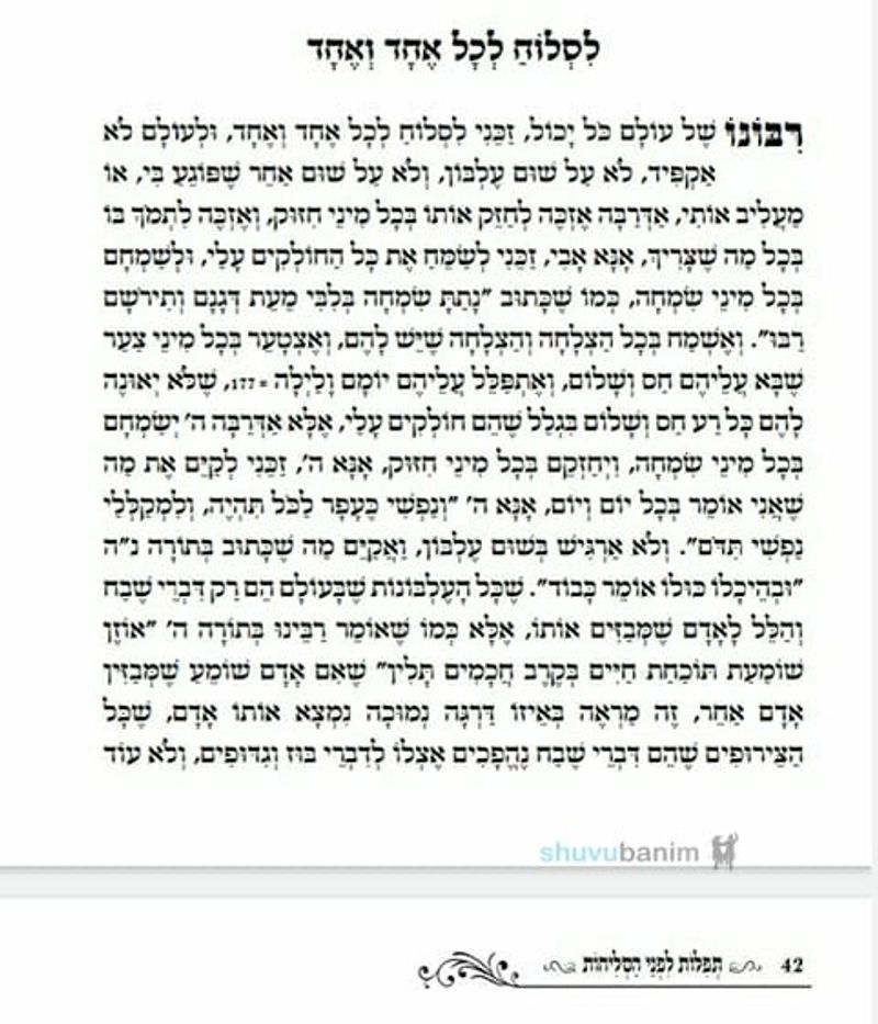 רִיבּוֹנוֹ שֶׁל עוֹלָם זכני בִּזְכוּת הַתְּפִילּוֹת וְהַסְּלִיחוֹת שֶׁל חוֹדֶשׁ אֱלוּל לַעֲקוֹר אֶת כָּל הַטֻּמְאוֹת מִן הָעוֹלָם בִּפְרָט מֵהַטֻּומְאוֹת שֶׁגָּרַמְתִּי אֲנִי לַקּוֹדֶשׁ הַקֳּדָשִׁים, וְלִמְקוֹם הַמִּזְבֵּחַ, שֶׁעַל יְדֵי זֶה אָנוּ אוֹמְרִים בְּכָל יוֹם וְיוֹם לִפְנֵי הַתְּפִילָּה אֵיזֶהוּ מְקוֹמָן שֶׁל זְבָחִים.