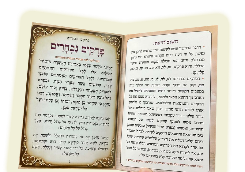 הפרקים נבחרים שהעיד כ"ק הגה"צ הרב אליעזר ברלנד שליט"א, שקיבל אותם מרבינו הקדוש רבי נחמן מברסלב, ושמתפרסמים בכול העולם על שלל המעלות הנשגבות שיש בקריאתם. עכשיו מגיעה עדות מתוך קהילות הפרסים באירן, אמריקה וגרמניה, שגם שם מופצים מאות עותקים שממש מחזירות את כולם לצור מחצבתם.