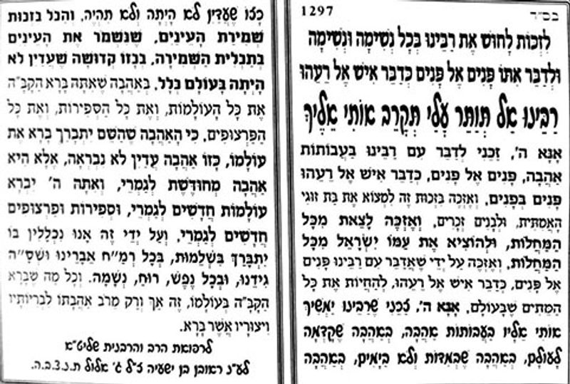 אָנָּא ה', זַכֵּנִי לְדַבֵּר עִם רַבֵּנוּ בַּעֲבוֹתוֹת אַהֲבָה, פָּנִים אֶל פָּנִים, כְּדַבֵּר אִישׁ אֶל רֵעֵהוּ פָּנִים בְּפָנִים, וַאֲזַכֶּה בִּזְכוּת זֶה לִמְצֹא אֶת בַּת זוּגִי הָאֲמִתִּית, וּלְבָנִים זְכָרִים, וְאֶזְכֶּה לָצֵאת מִכָּל הַמַּחֲלוֹת, וּלְהוֹצִיא אֶת עַמּוֹ יִשְׂרָאֵל מִכָּל הַמַּחֲלוֹת, וְאֶזְכֶּה עַל יְדֵי שֶׁאֲדַבֵּר עִם רַבֵּנוּ פָּנִים אֶל פָּנִים, כְּדָבָר אִישׁ אֶל רֵעֵהוּ, לְהַחֲיוֹת אֶת כָּל הַמֵּתִים שֶׁבָּעוֹלָם.