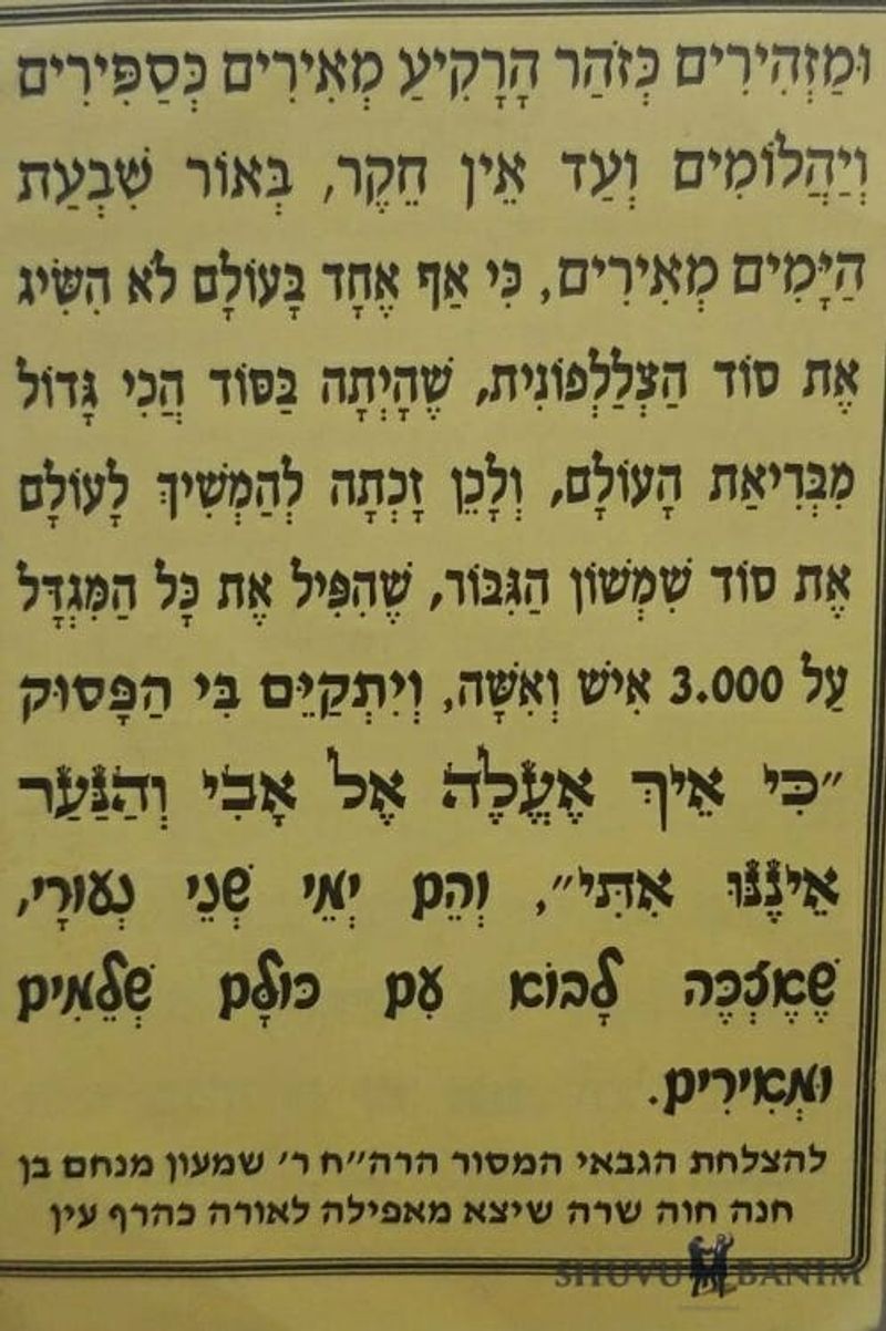 Because no one in the world grasped the secret of the Tzlalifonet who was the biggest secret since the creation of the world and therefore she merited to draw into the world the secret of the Mighty Shimshon who toppled the entire tower on to 3000 men and women.