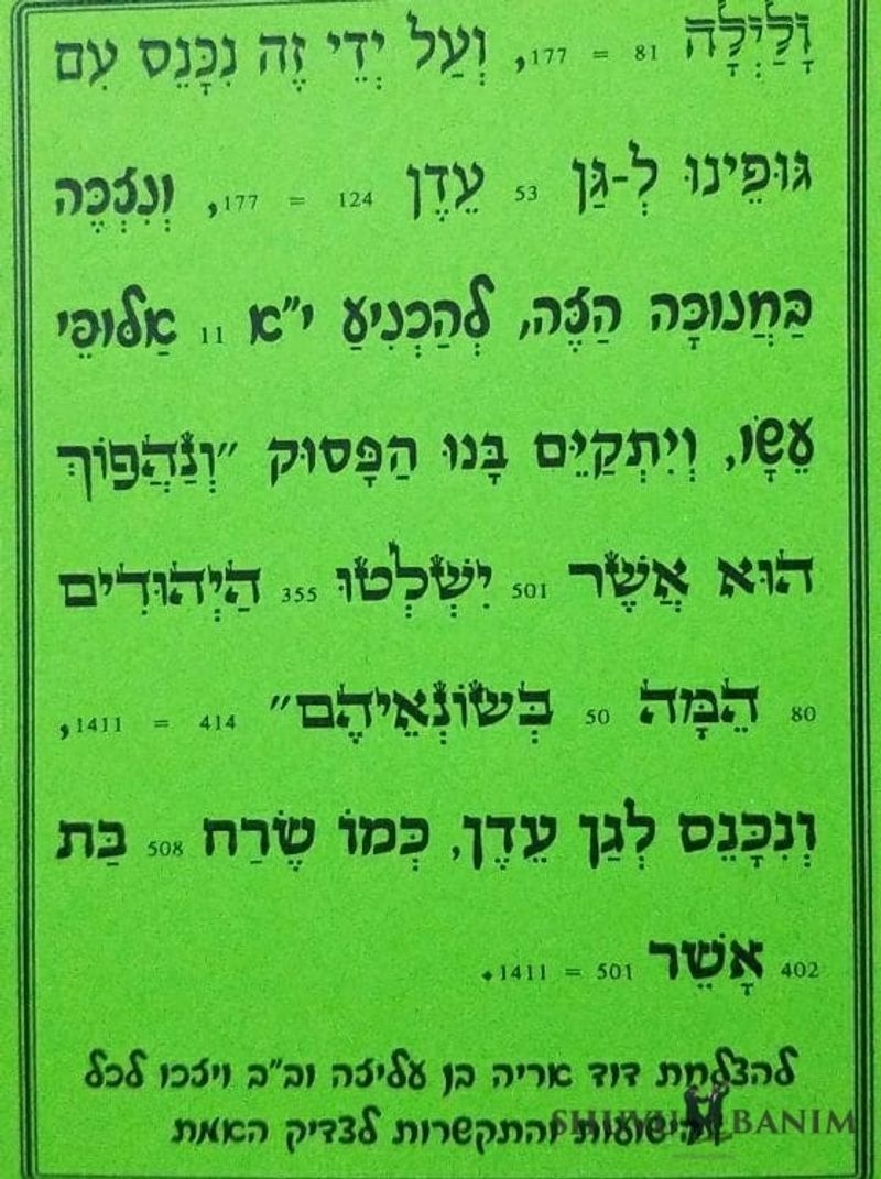 Master of the world, in the merit of the second candle of Hanukah, which represents the sefirah of Chochmah, that there will shine on us the light of Chochmah from Atika Kadisha. And may we merit that the light of Chochmah from Atika will shine on us day (96) and night (81) = 177.And through this may we enter with our bodies into Gan (53) Eden (124) = 177 and may we merit in this Hanukah to subdue the eleven (11) Chiefs of Esav.And may there be fulfilled in us the verse, “and it was turned around that which (501) the Jews (80) will rule (355) there (50) on their enemies (414)” = 1411 and enter Gan Eden, like Serach (508) the daughter (402) of Asher (501) = 1411.