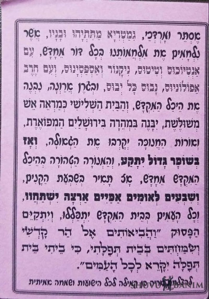 Master of the world, “the flask of oil will not be lacking”, in the merit of the Chanuka candles that shine like the sun, like sapphires, and in the merit of the seven branches, there will be for you seventy nations, and they will go with the light of the seven candles, all seventy nations. And Jerusalem will shine with the light of the stones of the kadkod (Jacinth), that is drawn down from the light of the holy Matriarchs, and in the merit of Yehudit who cut off the head of the enemy, we will excise also today the enemies and those that cause harm. And in the merit of Esther and Mordechai, the numerical value of Mattityahu and his sons, who fight our wars in every generation anew, with Antiochus and Titus, Nikanor and Aspasianus, and with the sword of Apolonius, and the threshing floor of Aravna, we will build the sanctuary of the Mikdash. And the third Temple with the appearance of three-fold fire, will be built speedily in the beautiful Jerusalem, and the lights of Hanukah will bring closer the redemption, and then the great shofar will sound.And the pure Menorah in the sanctuary of the Mikdash will renew, and then it will shine with the seven branches, and the seventy nations will bow and prostrate themselves to the ground.