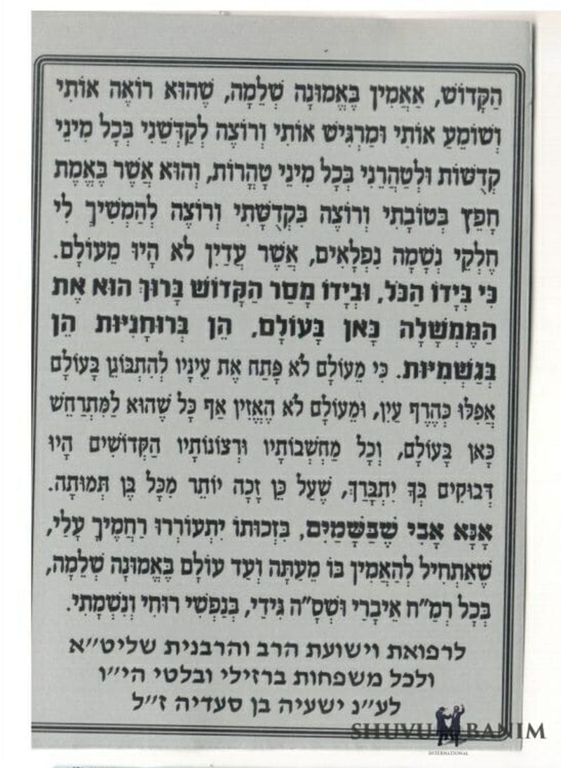Please, my Father in Heaven, in his merit may Your mercy be awakened for me, so that I will begin to believe in him from now and forever with complete faith, in all 248 limbs and 365 sinews, in my nefesh, ruach and neshama.