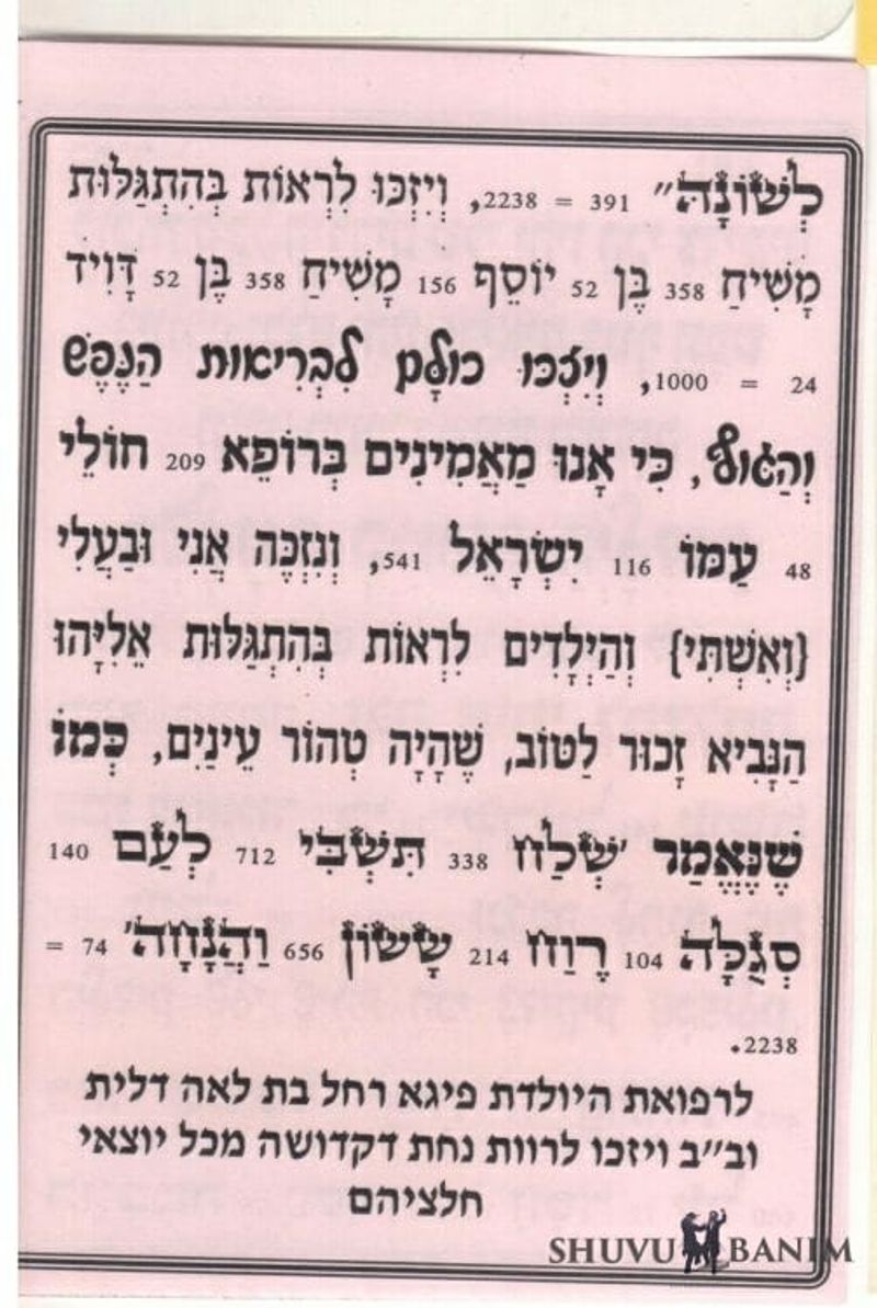 Master of the world, Who can do anything, from Whom nothing is hidden, may I merit success, like it says, “because (30) Israel (341) does (381) valor (48)”. And may we merit to educate our children to be the most righteous in the world, like it says, “her mouth (95) opened (493) in wisdom (75) and the Torah (1012) of kindness (72) was on (100) her tongue (391)” = 2238.And may we merit to see the revelation of Moshiach (358) ben (52) Yosef (156) Moshiach (358) ben (52) David (24) = 1000.And may we all merit a healthy soul and body, because we believe in “the Healer (209) of the sick (48) of His people (116) Israel (541)”. And may we merit, me and my husband (wife) and the children to see the revelation of Eliyahu the prophet who is remembered for good, who was pure in his eyes, like it says, “send (338) Tishbi (712) to the people (140) a segulah (104) relief (214) joy (656) and rest (74)” = 2238.