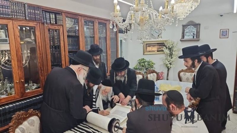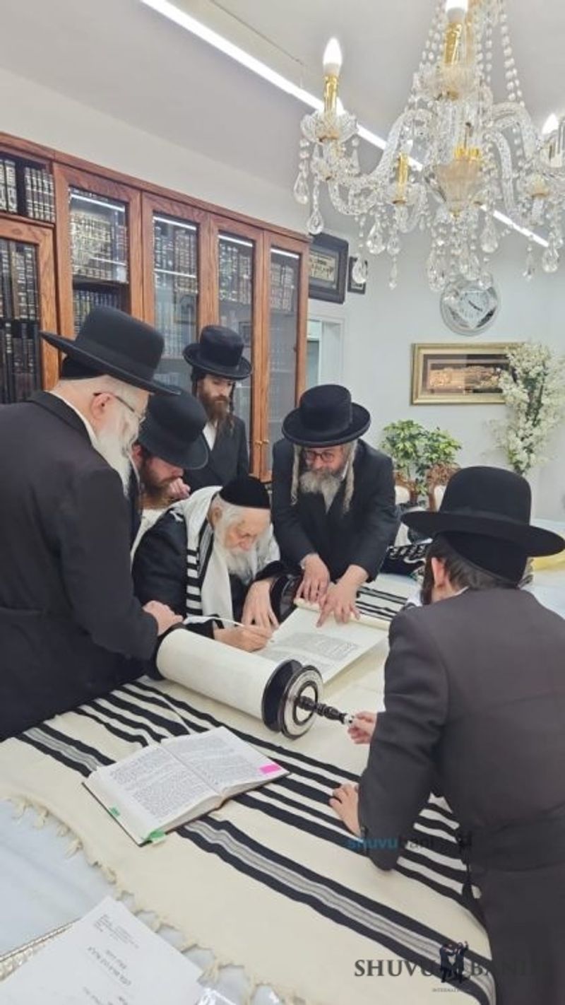The day before the dedication of the Torah scroll, as mentioned, an event for writing the last letters was held at the home of Moreinu HaRav shlit"a. Present at the event were R’ Gavriel Grossman shlit"a and his son-in-law R’ Motta Frank shlit"a. During the event, Moreinu HaRav shlit"a spoke, mentioning the departed in whose names and memory the Torah scroll was dedicated, and also relating “stories from ancient times.”
