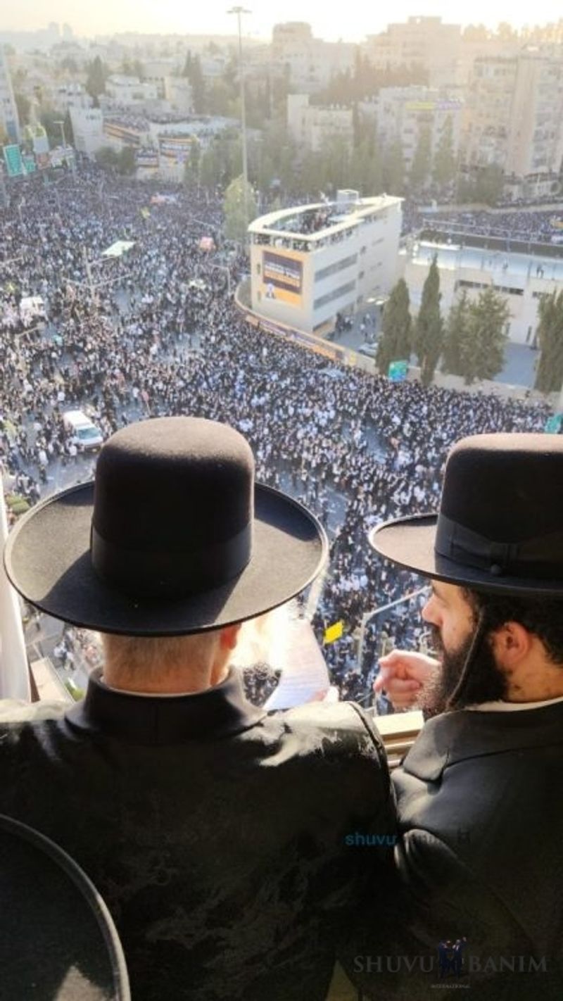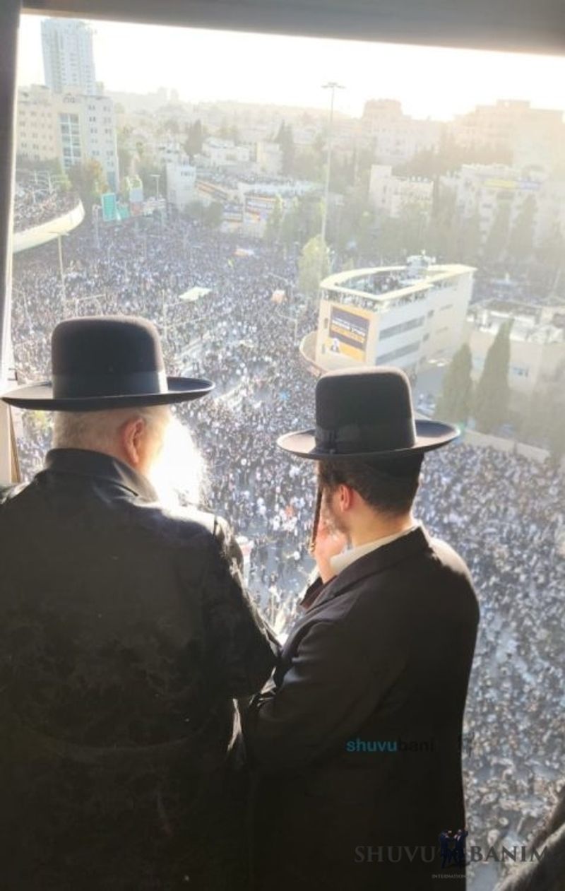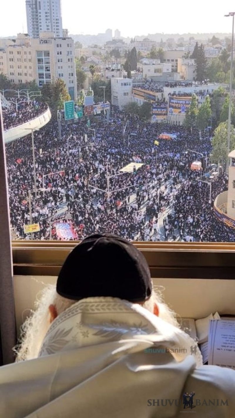A little after 3:00 PM, the Rav shlit”a appeared at the window on the upper floor of the “Shaarei HaIr” overlooking the crowds of Jews standing in prayer for the salvation of the Torah world. After his location was publicized, our community came and gathered to stand in prayer beneath the window, and for forty minutes throughout the rally, the Rav shlit”a was visible from the hotel window. The attendants of Moreinu HaRav shlit”a relate that he participated and recited the entire order of prayer for the rally as established by Gedolei HaDor. A little before the end of the rally , at the last Kaddish, the Rav shlit”a returned inside the hotel. He waited until about an hour after the rally ended, until the crowds cleared the streets of the Holy City and the roads opened. At close to 5:30 PM, he returned to his holy home.