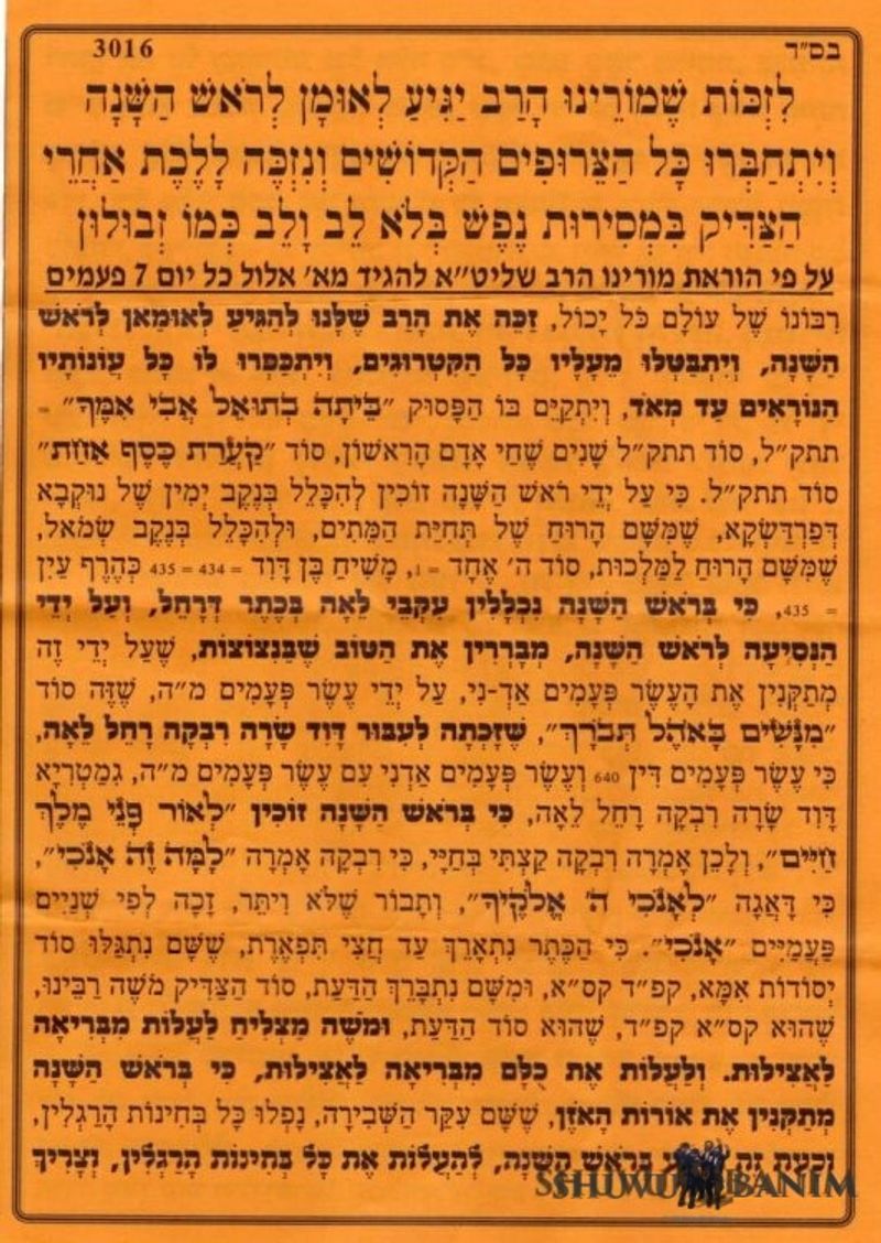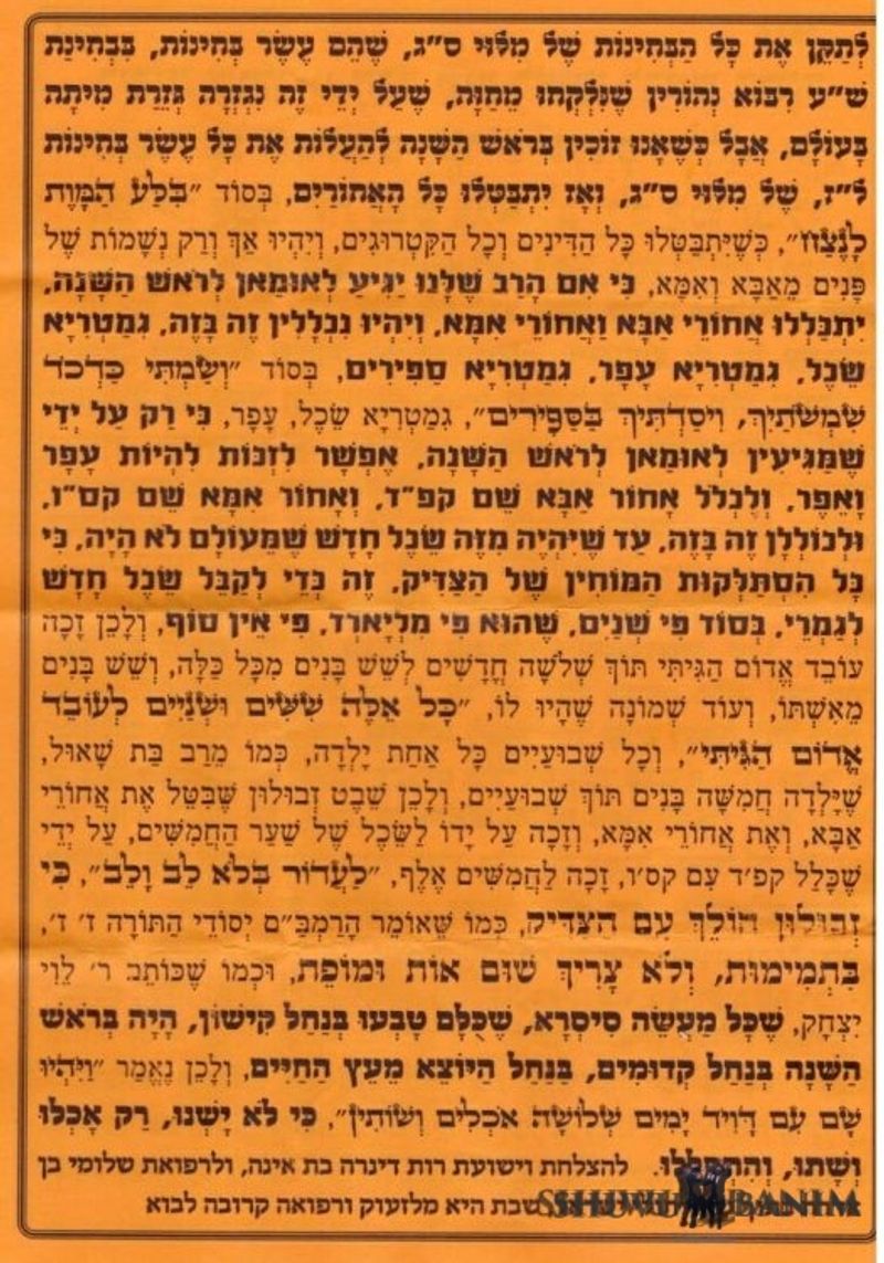 Ribbono Shel Olam – Master of the World, Who can do everything, grant our Rav the merit to reach Uman for Rosh Hashanah, and may all the accusations be nullified from upon him, and may all his terrible iniquities be atoned for him, and may the verse be fulfilled in him, “to the house of Betuel, your mother’s father” = 930, because through Rosh Hashanah, we merit to be included in the right nostril of “Nukva D’Fardaska,” from which the spirit of the resurrection of the dead emerges, and to be included in the left nostril, from which the spirit emerges to Malchut (Kingship), the secret of Hashem is One = 1, Mashiach ben David = 434 = 435, in the blink of an eye = 435. For on Rosh Hashanah, the heel of Leah is included in the Keter (Crown) of Rachel, and through the journey for Rosh Hashanah, the good in the holy sparks is purified and elevated, and through this, the ten Names “Ado-ni” are rectified through the ten Names of MaH, which is the secret of “By women in the tent will she be blessed,” that she [Yael] merited to an ibur (spiritual impregnation) of [the souls of] David, Sarah, Rivka, Rachel, Leah, for ten times din (judgment) 640 and ten times Ado-ni together with ten times MaH is the numerical value of David, Sarah, Rivka, Rachel, Leah, for on Rosh Hashanah, we merit to “the light of the king’s countenance is life.” Therefore, Rivka said, “I am disgusted with my life,” because Rivka said, “Why am I (anochi) thus,” because she was worried about “I (anochi) am Hashem your God.” And Tavor, which did not give up, merited to a double portion, two times “anochi,” for Keter was lengthened until half of Tiferet, where the secret of the Yesodot of Ema is revealed – KaPaD (184) KaSA (161), and from there Da’at (Knowledge) was blessed, the secret of the Tzaddik Moshe Rabbeinu, who is KaSA KaPaD, who is the secret of Da’at, and Moshe succeeded in ascending from Beriah to Atzilut, and to elevate everyone from Beriah to Atzilut, because on Rosh Hashanah, the lights of the ear -- where the main shattering [of the vessels] is, and all the aspects of the legs fell – are rectified. And now, on Rosh Hashanah, is the time to elevate all the aspects of the legs, and we need to rectify all aspects of the milui of SaG, which are ten aspects, in the aspect of the 370 multitudes of lights that were taken from Chava, through which death was decreed on the world. But when we merit on Rosh Hashanah to elevate all ten aspects of LaZ of the milui of SaG, all the achoraim (the aspect of the back) will be nullified, the secret of “He will swallow up death for eternity,” when all the judgments and accusations will be nullified, and there will only be souls of panim (the aspect of the front or face) from Abba and Ema. For if our Rav reaches Uman for Rosh Hashanah the achoraim of Abba and the achoraim of Ema will be included in one another, the numerical value of sechel (intellect), the numerical value of afar (dust), the numerical value of sapirim (sapphires), in the mystery of “I will set your window [frames] with ruby, and lay your foundation with sapphires,” the numerical value of sechel, afar. Because only through reaching Uman for Rosh Hashanah is it possible to be dust and ashes, and to include the achor of Abba -- the name KaPaD -- and the achor of Ema -- the name KaSU -- and to include them in one another, until from this a new intellect will emerge that has never been before. Because the whole departure of the mochin (mentalities) of the Tzaddik is in order to receive a totally new intellect, the secret of a double portion, which is a billion times, endlessly greater. Therefore, Oved-Edom the Gittite merited to six sons from each daughter-in-law within three months, and six sons from his own wife, in addition to the eight that he already had. “All of these were sixty-two for Oved-Edom the Gittite,” and every two weeks, each one gave birth, like Meirav bat Shaul, who gave birth to five sons within two weeks. Therefore, the tribe of Zevulun, which nullified the achoraim of Abba and the achoraim of Ema, merited through this to the intellect of the Fiftieth Gate. Through including KaPaD in KaSU, he merited to 50,000, “who arrayed themselves with a complete heart,” because Zevulun follows the Tzaddik, as the Rambam says in Yesodei HaTorah 7:7, in simplicity, not requiring any sign or wonder, like Rabbi Levi Yitzchak writes, that the entire episode of Sisra -- when everyone drowned in the Kishon stream – was on Rosh Hashanah, in the primordial stream, the stream that emerges from the Tree of Life, and therefore it is said, “They were there with David for three days, eating and drinking,” because they did not sleep, only eating, drinking, and praying.