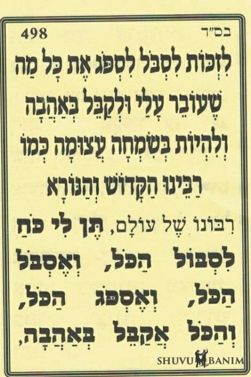 With Hebrew to English translation, AND transliteration. 498To merit to endure and absorb with love, everything that happens to me. And to be in a state of profound happiness, like our awesome and holy Rabbenu.