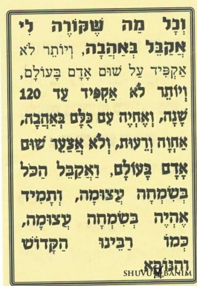 TRANSLITERATION: Ribonu shel olam, Ten li koach lisbol hakol. Ve’esbol hakol. Ve’espog hakol. Ve hakol ekabel be’ahava. Ve kol mah she koreh li, ekabel be’ahava. Ve’yoter lo ekpid al shum adam be’olam. Ve’yoter lo ekpid ad 120 shana. Ve’ ehyiyeh im kulam be’ahava, achva ve’reut. Ve lo ahtzeir shum adam be’olam. Ve’ ekabel hakol be’simcha atzuma. Ve tamid ehyiyeh be’simcha atzuma, kamo Rabbenu HaKadosh ve’Hanorah.====