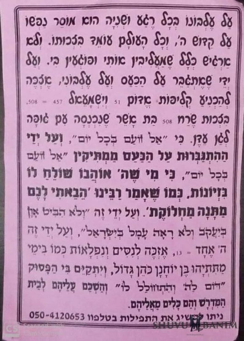 [Please Hashem] help me not feel that they are insulting me or hurting me. And through this, that I should overcome feelings of anger and insult, please grant me the merit to subdue the klipa (spiritual husk) of Edom (51) and Yishmael (457) = 508 in the merit of Serach (508) the daughter of Asher who entered with her body into Gan Eden. Because [the verse says] “G-d becomes angry every day”*, but through overcoming anger one mitigates: “G-d becomes angry every day” because one who Hashem loves, He sends him insults, as out teacher (Rebbe Nachman of Breslov) said:“I brought for you a gift – machlokes/controversy”.And through this: “And he doesn’t ascertain sin in Yaakov and he doesn’t see toil in Yisrael” and through this, One G-d = 13, let me merit miracles and wonders as in the days of Matisyahu the son of Yochanan Kohen Gadol and fulfill in me the verse: