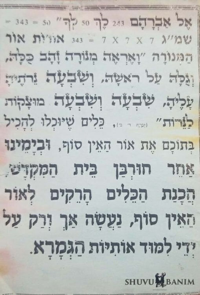 "And he said go and borrow for yourself vessels from outside from all your neighbors empty vessels don’t decrease".Master of the world, who can do anything, grant me the merit to prepare infinite vessels to contain the Infinite Light, "Empty vessels don’t decrease", that the light of the seven days can be entered into them, the light of the Menorah, as it says: "And Hashem said to Avraham (243) go (50) for yourself (50) = 343 = 7 x 7 x 7 = 343," the lights of the lights of the Menorah, "And I saw a golden Menorah, all of it, a bowl on its head and its seven candles on top of it, seven and seven ducts for each of the candles," vessels that can contain in them the light of the infinite. And in our days, after the destruction of the Holy Temple, preparing vessels for the light of the infinite can only be done through learning the letters of the Gemara.