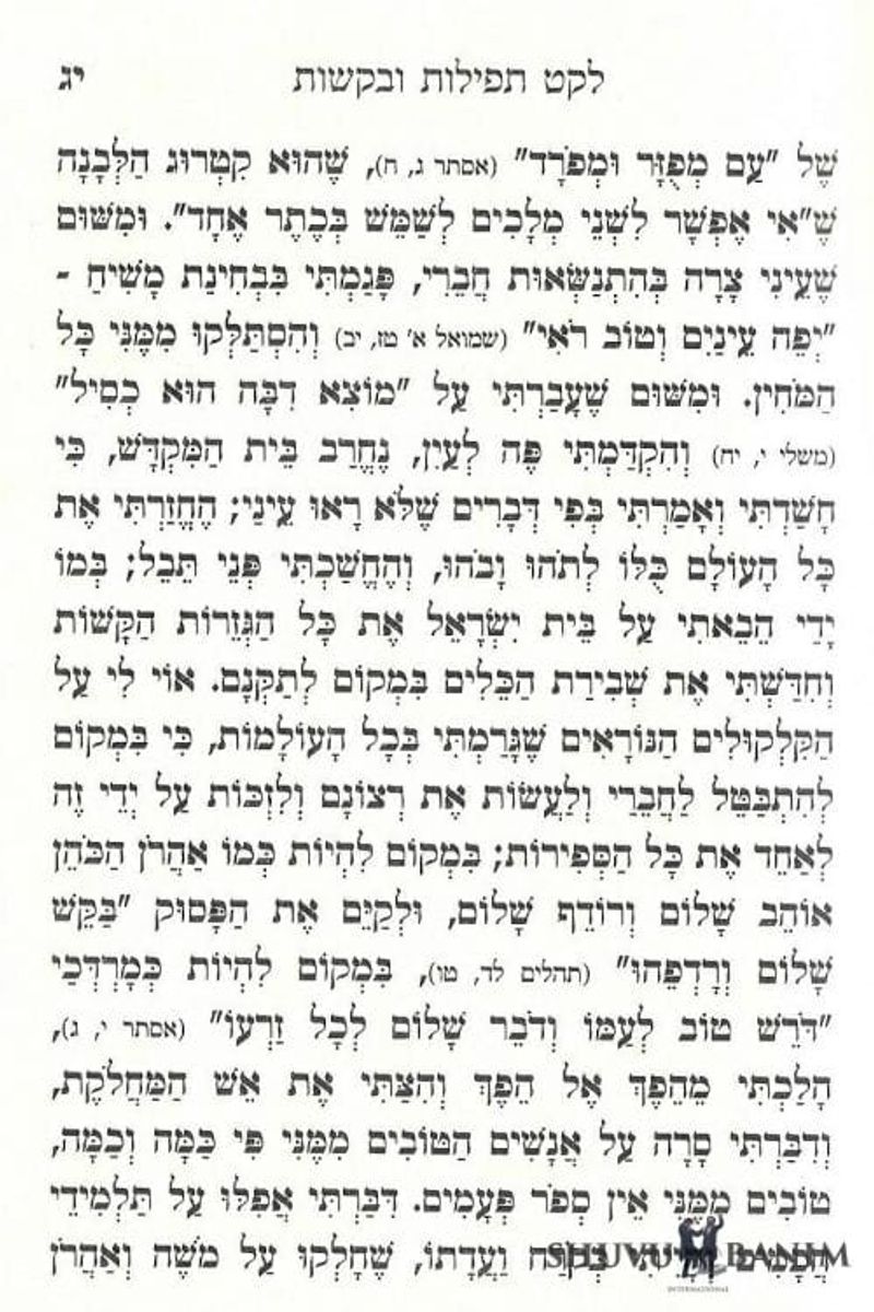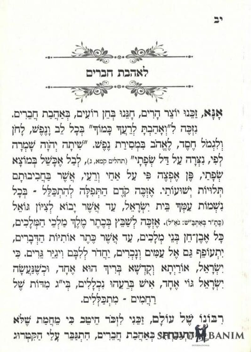 Please, the One Who forms the mountains – let us merit, grace us with the grace of shepherds, with the love of friends. Let us merit to “Love your fellow as yourself” with complete heart and soul, to graciously give and bestow kindness, to love with self-sacrifice. “Place a guard for my mouth, Hashem; guard the door of my lips” (Tehilim 141:3), so that I shouldn’t falter in what leaves my lips, lest I open my mouth about my brothers and companions, in whose friendliness my salvation is dependent. Let me merit before prayer to encompass myself in all the souls of Your people Israel, until the redeemer comes to Zion (Keter - Crown in the AT-BaSH cipher: Goel - Redeemer). Let me merit to set in the crown of the King of All Kings every gemstone – the children of kings [e.g. the Jews], until the crowns on the letters of the words will fly also to the nations and gentiles, penetrate their hearts and make converts. Because Israel, the Torah, and the Kadosh Baruch Hu are one, and when Israel is made into one nation, each person encompassed in his fellow, in Thirteen Attributes they are encompassed. Ribono Shel Olam – Master of the World, let me merit to remember well that because I didn’t overcome [to perform the mitzvah] of loving one’s fellow, the accusation of “a scattered and dispersed people” (Esther 3:8) overcame me, which is the accusation of the moon that “it’s impossible for two kings to wear one crown.” And because my eye is jealous over the success of my friend, I blemished the aspect of Mashiach – “Fair eyes and a pleasing appearance” (Shmuel I 16:12), and all the supernal mentalities have departed from me. And because I transgressed “a slanderer is a fool” (Mishley 10:18) and my mouth preceded my eye, the Holy Temple has been destroyed, because I suspected and said with my mouth things which my eyes didn’t see; I returned the entire world to chaos and void, and I darkened the face of the earth; with my own hands I have brought onto the House of Israel all the harsh decrees, and I renewed the shattering of the vessels instead of rectifying them. Oy to me for the terrible destruction which I’ve caused in all the worlds, because instead of nullifying myself to my colleagues and to do their will, and to merit through this to unify all the divine emanations; instead of being like Aharon HaKohen, to love peace and pursue peace, and to fulfill the verse, “Seek peace and pursue it” (Tehilim 34:15), instead of being like Mordechai, [one who] “seeks the wellbeing of his people and speaks peace to all his offspring” (Esther 10:3), I did the complete opposite and ignited the fire of dispute and spoke evilly about people who are many, many times better than me, better than me countless times. I even spoke about Torah scholars and have been like Korach and his congregation, who disputed Moshe, Aharon, and the upright congregation of the Children of Israel, almost returning the entire world to chaos and void. Please, Merciful and Gracious G-d, let us merit to love each person with heart and soul. Let us merit to see only the virtues in our friends and not their lacks, to escape from the aspect of “scattered and dispersed” and to merit to the aspect of “and Israel camped there opposite the mountain” (Shemos 19:2), like one man with one heart.