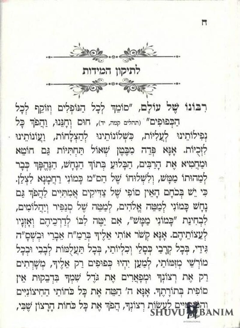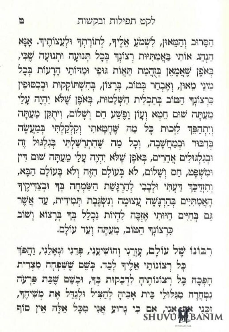 Ribono Shel Olam – Master of the World – “Who supports all the fallen, and straightens all the bent” (Tehilim 145:14) – Take pity and be gracious to us, and turn all of our falls into ascents, our failures into successes, our sins into merits. Please, redeem from the recesses of the bottom pits of purgatory also a sinner and one who causes the masses to sin, one swallowed up inside the serpent and who has already turned into its essence exactly, one who is a messenger of the Evil One – such as me, G-d save us. Because it is in the endless power of the true Tzadikim to turn also a serpent such as me into a staff of G-d, into a staff of sapphire and diamonds, into an aspect of “just like me,”[1] if he turns his heart to their ways and his ears to their advice. Please bind me to You with my 248 organs and 365 sinews, with all my innards, flanks, and kidneys, with all that’s hidden in my heart, and with all my strategies, so that they should be subordinate only to You, serving only Your will and beautifying the greatness of Your Name with endless devotion to Your Torah. Please Hashem, incline all my internal and external powers to do Your will. Turn all the powers of will within me, rejection and refusal, to listen to You, to Your Torah, to Your advice. Please guide me in the truth of Your will in every single movement within me, in a way that I will refuse the filth of the lusts of my body and my evil traits with all types of refusal, and will choose good, with desire, yearning, and longing as befits Your good will with the ultimate completeness, in a manner that there will not be upon me from now on any sin, iniquity, or rebellion, G-d forbid, and all that I sinned and corrupted in action, word and thought, and all that I have been negligent in in this reincarnation and in other reincarnations will be rectified from now on and turned into merit, in a manner that there will be no decree or judgement upon me from now on, G-d forbid – not in this world and not in the next world, and my mind and heart will be purified for feeling joy in You and Your true Tzadikim, with an eternal, awesome and exalted feeling, until also in my lifetime I will merit to be encompassed within You with running and returning as befits Your good will, from now and forever. Ribono Shel Olam – Master of the World, help me and save me, free me and redeem me, and turn all of my desires to You alone. Just as an Egyptian maidservant turned all her desires into attachment to You, and just as Pharaoh’s daughter was purified from the idolatry of her father’s house in order to save and raise Your Messiah, let me also merit -- even if I’m worse than all of these endless times over -- to subjugate my desires to Your desire, to serve Your Tzadikim [who are] mighty warriors to do Your will. Let me merit to publicize their names and their Torah and to fulfill their advice, in a way that I will refuse evil with the ultimate refusal, and be disgusted by the filth of lusts and the evilness of traits, and that I will fulfill what is said of Yosef: “He refused” (Bereishis 39:8), will all types of refusal, and with all types of screaming, with thundering and great tumult, with shouting and great fear, with true binding to the true Tzadikim, until I will be attached to and be encompassed in his [Yosef's] awesome righteousness to split the sea for all the Jewish people and to reveal to each person his path according to his soul root. Please, let me merit through the power of Yosef HaTzadik to refuse with the ultimate refusal everything that is an evil lust, every evil trait, anger, rage, gratuitous hatred, until all my iniquities are atoned for, whether in this reincarnation or other reincarnations, and there will be no decree or judgement upon me, G-d forbid, not in this world and not in the next world. Purify my mind and my heart -- at a time when all creatures are singing and shouting with gladness, exulting and rejoicing in You and Your true Tzadikim -- to feel joy only in Hashem alone and in those who fear Him and do His will with an eternal, awesome, and exalted feeling, in an aspect of “They believed in Hashem and in Moshe His servant” (Shemos 14:31), and let me merit to be encompassed in You as befits Your good will, in truth, from now and forever. My G-d and the G-d of my forefathers, Who graces man with knowledge – Please, endow me graciously from Yourself with wisdom, understanding, knowledge, that I shouldn’t falter again in sins, iniquities, evil lusts, or disgusting traits. Please, have mercy on me in Your kindness, and teach me Your ways, and let me merit to grasp Your holy traits, the ways of Your goodness and Your mercy, which are drawn from the Thirteen Attributes of Mercy, through which You behave with all Your creatures, until also I will merit to walk in Your ways and to have mercy on Your creatures with true mercy -- with all types of mercy that are included in Your Thirteen Attributes of Mercy -- and will merit to be good to everyone. ---- [1] See “Tzaddik” (the translation of “Chayei Moharan” by the Breslov Research Institute), p. 247: “I myself heard the Rebbe say many times that the main thing is a person’s work and effort, nothing else. Everything depends on effort. Through work and effort everyone can reach great levels. The Rebbe said: “I can turn a person into a worthy Jew – what they call a guter Yid – and make him just like me! Literally!”