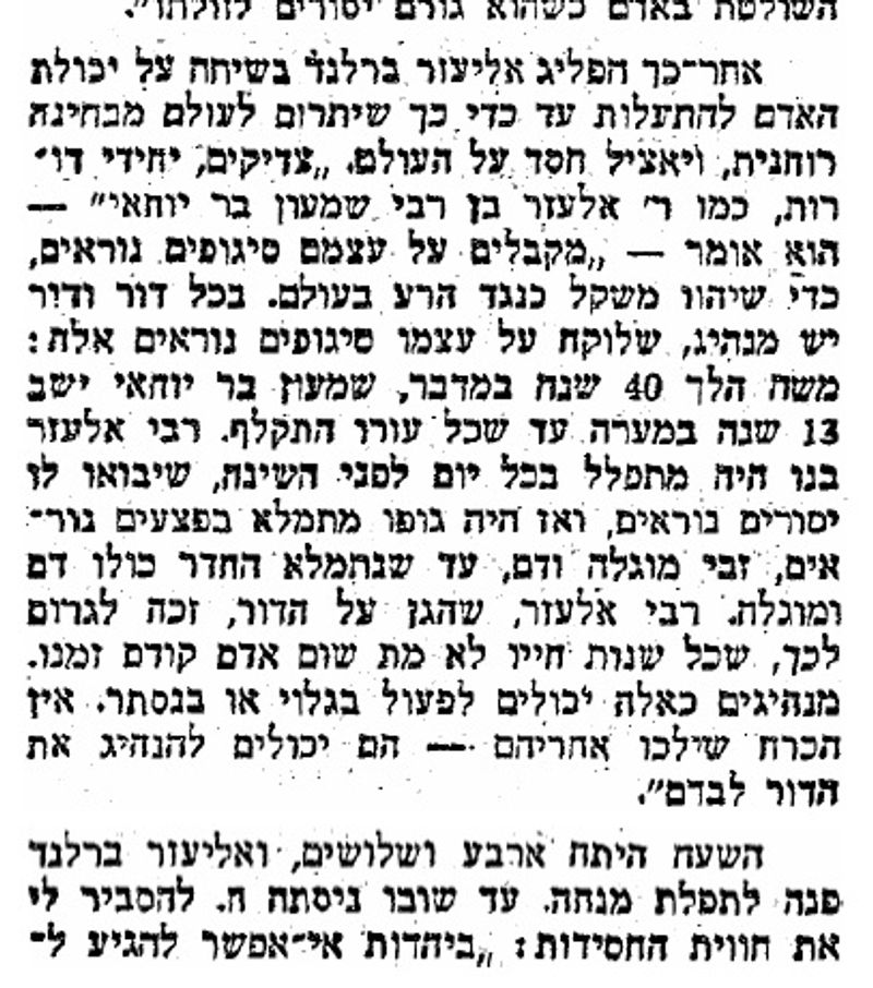 "Rabbi Elazar would pray every day that terrible sufferings would come to him, until his body was filled with wounds and the entire room was filled with blood and pus. Rabbi Elazar, who protected the generation, merited to ensure that throughout all the years of his life, no person died before their time. Such leaders can act openly or in secret. It is not necessary that people follow them; they lead the generation alone," said our teacher, Rav Berland shlit"a, to Maariv, effectively revealing even then a glimpse of the tzaddik's intention in accepting sufferings upon himself.