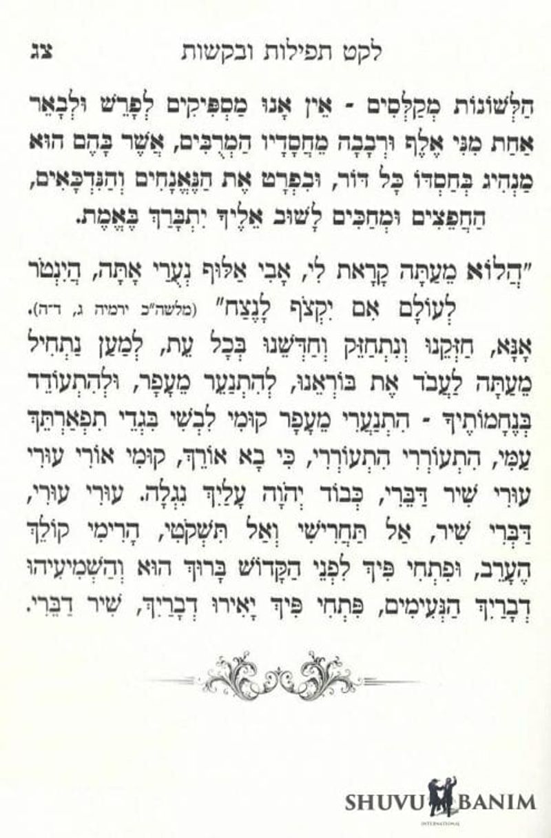 Please, Compassionate and Gracious, redeem me and save me from the palm of the schemer and the violent one, because You are full of mercy and kindnesses without end or limit, reaching even a sinner and rebel like me, who is wallowing in a path which is filthy with all types of sin and iniquity, stricken with all types of despair, sadness, and brokenness, until it seems to him that all hope is lost, and that he is found in an unsalvageable [situation]. In the bitterness of my speech, I said there is no one who can raise me up from my descent, there is no one who can awaken me from my slumber, because behold, all my days and years have passed over me in nothingness and emptiness, with blemished thoughts and forbidden sights, which blemished the Nefesh and Ruach, and which distanced from me the Neshama, Chaya, and Yechida. “Save my soul from the sword, my essence from the grip of the dog. Many bulls surround me; Bashan’s mighty ones encircle me. They open their mouths against me like a tearing, roaring lion. I am poured out like water, and all my bones became disjointed; my heart is like wax, melted within my innards” (Tehilim 22: 21, 13-15). Compassionate and Gracious, Who opens a hand to rebellious sinners and desires their repentance, from where will our help come, and from where will our salvation come, since we are distant from any true regret, and from any true acceptance [to change] in the future, that we will not sin again, forever. However, we will not allow any despair – because there is no transgression more awful than it – to bring us down, chas v’shalom, because despite our distance from repentance, we believe in complete faith, and know clearly, that great is the strength of the true Tzaddik in each generation, to awaken us to true repentance, and to true regret, from the greatest depths of the heart, great is his strength to nullify our materialism, and to uproot our arrogance, which is the root flourishing with gall and wormwood, to uproot from us once and for all time, all evil thoughts and forbidden sights, which are the fruit of tens and hundreds of reincarnations in which we were reincarnated in the deepest abyss and below it, from the time of the sin of the Tree of Knowledge until today. Our Father, Merciful Father, behold You revealed to us that there is no despair in the world at all, and You are ready also now, at this moment mamash, to return the glory to its former state, to return us to our roots and our splendor, because You do not want us to fall into despair, chalila, which is harder than the first ones, casting a person down to the lowest abyss and below it, chas v’shalom. You do not want us to despair, chas v’shalom, even a hairsbreadth, because thoughts and ideas and confusions such as these are harsh and cause harm, and anger our Creator more than all the sins, iniquities, and rebellious sins from the time we have existed until this day. Please, please draw us out of the treacherous waters, elevate us from despair, from cessation and destruction, because we still have great hope at every time, at every hour, and at every moment. “Hashem’s kindness surely has not ended, nor are His mercies exhausted” (Eichah 3:22). Only what shall we do, and all of this is hidden from us, because of our many downfalls, because in our distance we would not know the power of His abundant mercies and great kindnesses for all who desire to return in truth, even though they have not yet returned. In our foolishness, we would not know the whole greatness of His salvation. We would not know that all His, the Blessed One’s, desire is to return and to have mercy on all those who are waiting and longing for Him – those yearning and striving to find deliverance and refuge to return to Hashem Yitbarach, even though perplexities overwhelm them at every moment, and for days and years do not allow them to return to their Father’s house. Our Father in Heaven, G-d, Gracious and Merciful, would that we should know, repeat, and remember that despite all our downfalls, His kindness has very greatly overwhelmed us without measure, estimation, or number, what the mouth cannot speak and the heart think. Because even if all the seas were dye, and all the lakes quills, and all people scribes, and all tongues exalting – we will not suffice to explain and elucidate one in a thousand and a multitude of His abundant kindnesses, through which He leads in His kindness every generation, and especially those who are sighing and despondent, desiring and waiting to return to You, the Blessed One, in truth. “If only from now on you would call Me ‘My Father! You are the Master of my youth.’ Would He be angry forever?” (based on Yirmiyah 3:4-5). Please, strengthen us and we will be strengthened, and renew us at every moment, so that we may begin from now to serve our Creator, to shake ourselves off from dust, to be encouraged by Your consolations – shake yourself off from the dust, arise, don the garments of your beauty, my people. Wake up, wake up, because your light has come. Rise up and shine, awaken, awaken, sing a song, the glory of Hashem is revealed upon you. Awaken, awaken, sing a song. Do not be mute and do not be silent. Raise your sweet voice, and open your mouth before the Kadosh Baruch Hu, and make your pleasant words heard to Him. Open your mouth, let your words shine, sing a song.