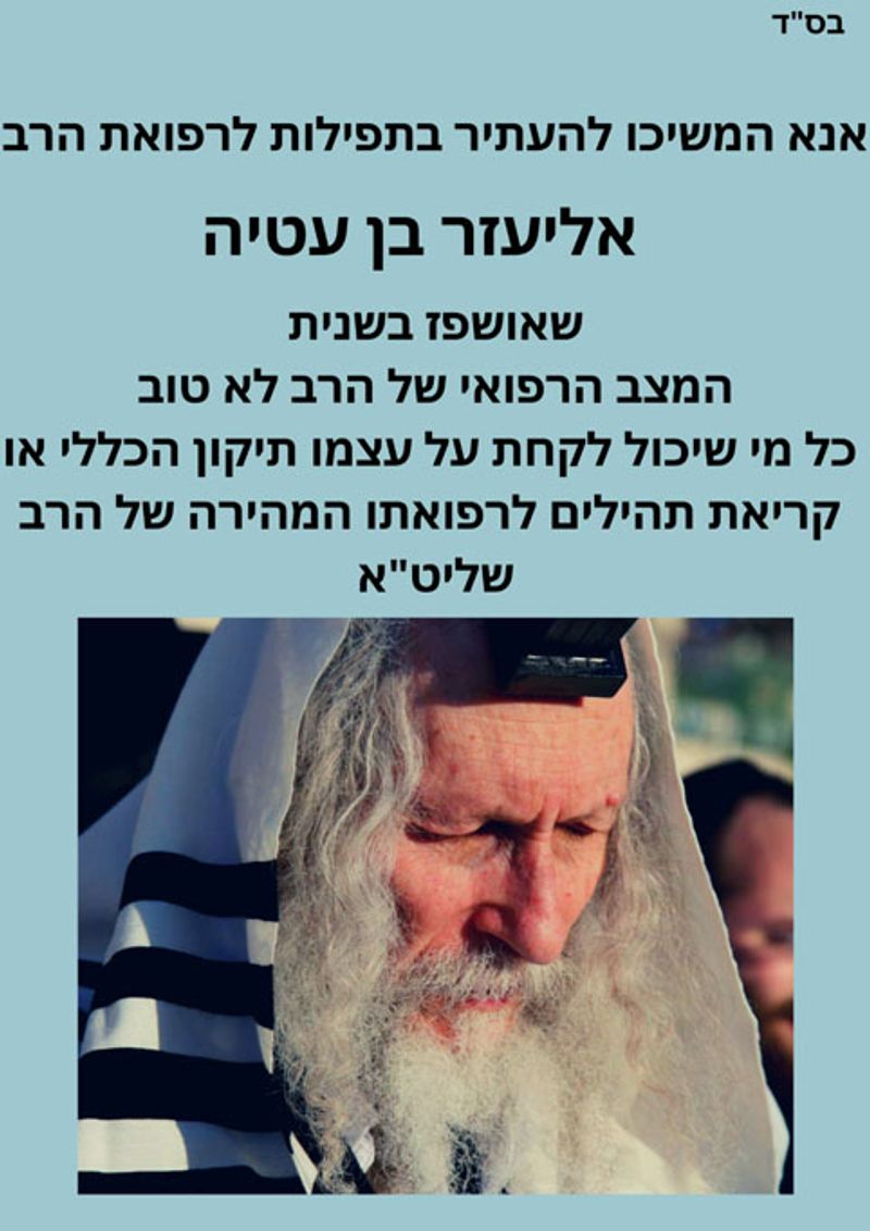 As is known, our teacher, the holy Gaon and Tzaddik Rabbi Eliezer Berland shlit"a (may he live long and good days), was evacuated to Hadassah Ein Kerem Hospital in Jerusalem. This hospitalization comes after the Rav was hospitalized about a month ago, on the Motzaei Shabbos (Saturday night) of Parshas Bechukosai 5779, in a difficult condition, at which time he underwent a cardiac catheterization and various other treatments.