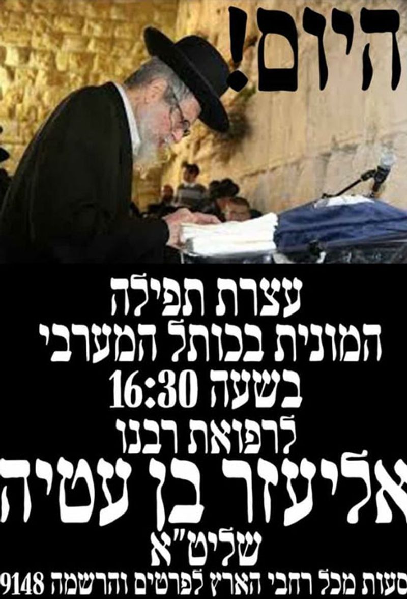 It was reported from the Rav's home that his condition has begun to improve slightly, but we still need to increase our prayers and supplications for the healing of the Tzaddik, which is the very success of Israel. Therefore, our teacher issued a holy call in his own sacred and pained voice to come and participate in a mass prayer gathering at the Kotel HaMa'aravi (the Western Wall).