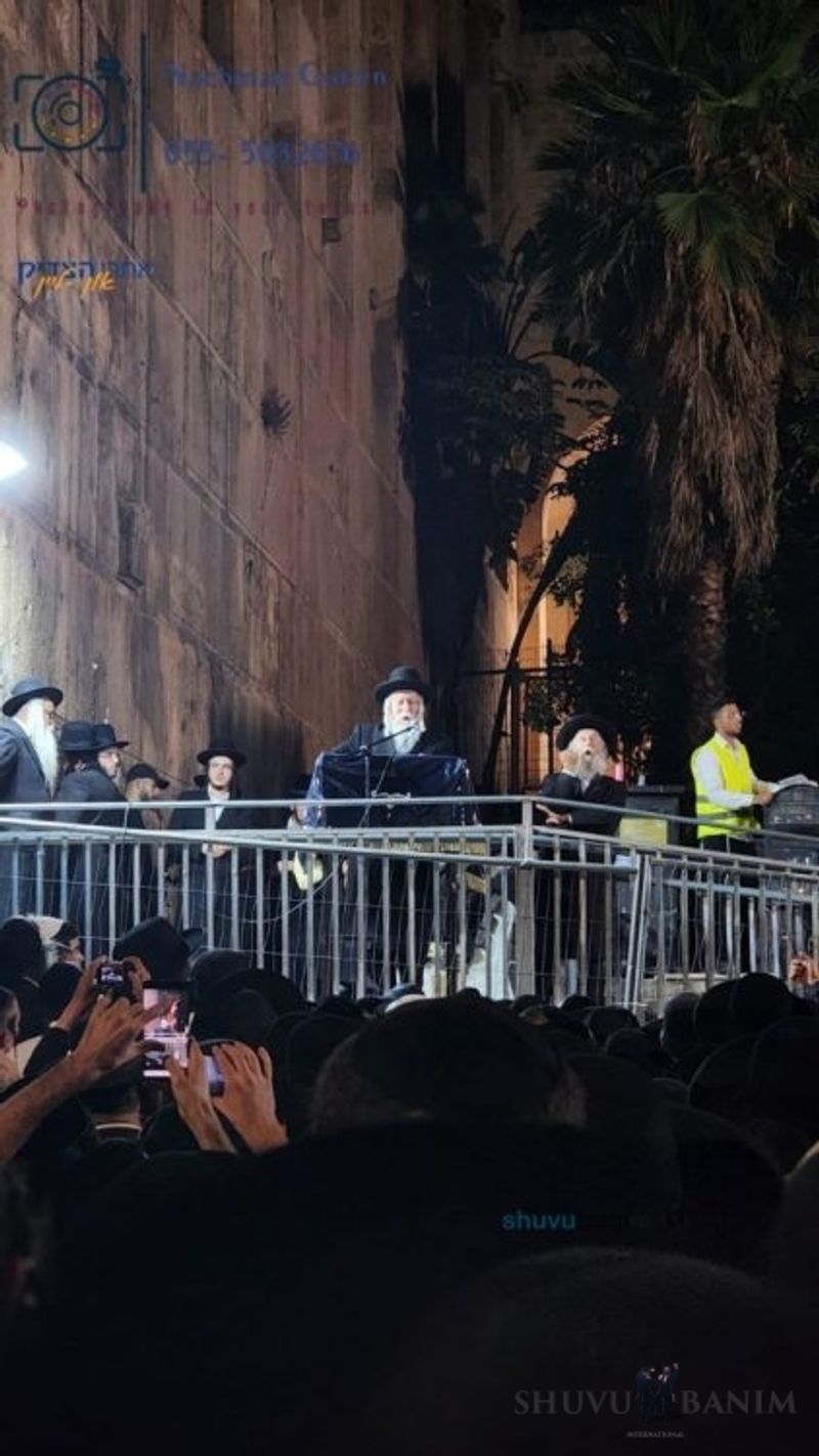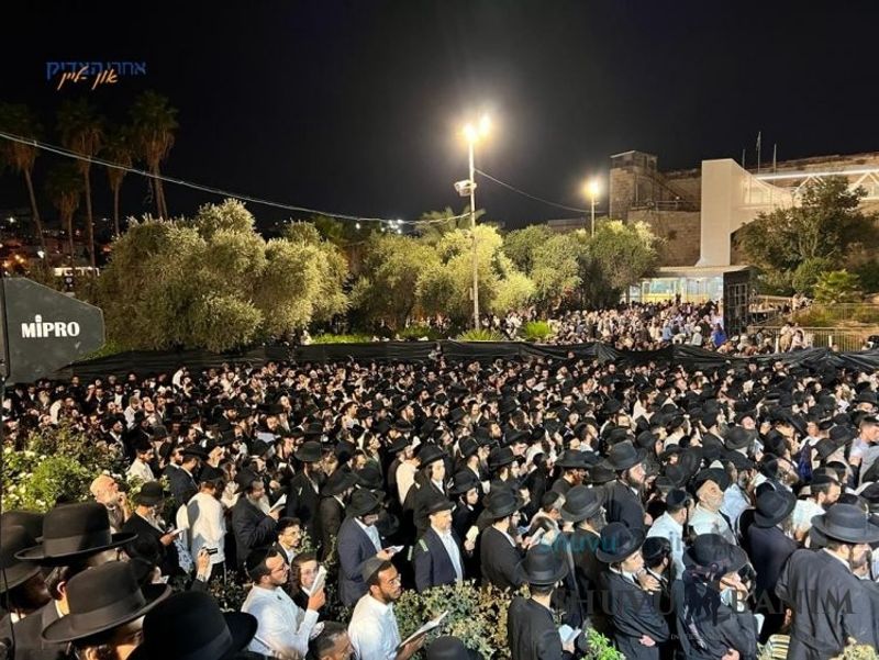 At 8:00 pm, the plaza of Ma'arat HaMachpelah began to fill up with thousands of people, with more than 100 buses coming from all of the country, and special parking lots for private vehicles were opened. According to the estimate of security forces at the height of the rally, some 5,000 people merited to participate. Until the Rav arrived, thousands danced to sweeten judgments. At 10:00 pm, the Rav shlit"a appeared on the platform above the famous "Seventh Step" with a face glowing with holiness. When the Rav arrived at the wall of the Maarat HaMachpelah, he stood for an unusually long time, saying a silent prayer, apparently in order to open the Gates of Tzion and to succeed in coming to the Rosh Hashanah gathering in Uman in 5784. After a number minutes, the Rav shlit"a stood on the platform and began the Ma'ariv prayer, roaring the entire prayer with fiery fervor and shut eyes, his holy face radiating light. After the conclusion of the prayer, the Rav shlit"a began saying the Tikkun HaKlali with a pleasing melody over the course of some twenty minutes, beginning with the Yehi Ratzon that is said before the Tikkun HaKlali. What a beautiful sight it was to see the entire assembly of thousands swaying according to that exalted rhythm which the Rav composed for saying the Ten Psalms which Rebbe Nachman revealed and enacted to say. At the end of the Tikkun HaKlali, the Rav shlit"a read the awesome prayer which was composed by Rabbi Yitzchak Breiter HY"D for opening up the locked gates of Uman. For several minutes, the Rav read the prayer together with the assembly with an outpouring of the soul and great arousal. At the end of the prayer, the Rav shlit"a said Kaddish and gave over a shiur of the words of the Living God with great fervor about the importance of the trip to Uman Rosh Hashanah 5784: "You need to know, that also the year 5784 -- will begin a year of redemption, a year that Mashiach will certainly come, for even Mashiach will travel to Uman. Rabbi Levi Yitzchak always said that even Mashiach [would travel to Uman]. The Rebbe said that Mashiach will somehow be revealed in the Land of Galilee, which is called Tiveria. From there, he will go to Beit Lechem, to the city of Rachel Emeinu. Together, they will go Maarat HaMachpelah, to here, to awaken Avraham, Yitzchak, and Yaakov, who are now hearing our prayers, for Avraham, Yitzchak, and Yaakov raise up all the prayers. Then three Shofars will descend from Heaven, and then Avraham, Yitzchak, and Yaakov will sound a Teruah, Tekiah, Teruah, Teruah, Tekiah, Teruah, Teruah, Tekiah, Teruah. And then the whole world will come to [make] war with the Jewish people, and this will be heard in the whole world -- this will be the Teruah of war, that Hashem is God, Hashem is God, and Hashem will be King over all the earth, all the world will crown Hashem. Then there will be an earthquake, and all the churches will fall together with the mosques, because it is forbidden for us to touch anything! And therefore, everyone must travel to Uman; even Mashiach will travel to Uman -- there is no question or debate about this. Whether the Rav succeeds in coming or if the Rav does not succeed in coming, it makes no difference at all, this makes absolutely no difference -- everyone is registered already today for Uman, with no exceptions. Then the gathering will be in Uman. And if not, then in Jerusalem. And if not, then in the Land of Fire or the Land of Ice. There is a Land of Fire and a Land of Ice. A three day trip in a boat [or] a flight in three hours. All of us will see each other either in the Land of Fire or the Land of Ice; either in Jerusalem or in Uman, bezrat Hashem, together with our Righteous Mashiach, speedily in our days, Amen!" After the exalted shiur, the Rav shlit"a began to sing "Becha Rabbeinu Nagilah," again approached the wall of Maarat HaMachpelah and kissed its stones. While all prayer, he took three steps back, and left amidst songs and melodies after some two hours of an exalted rally which certainly accomplished what it did, and we have no concept or understanding of the accounting of Heaven.Video and gallery