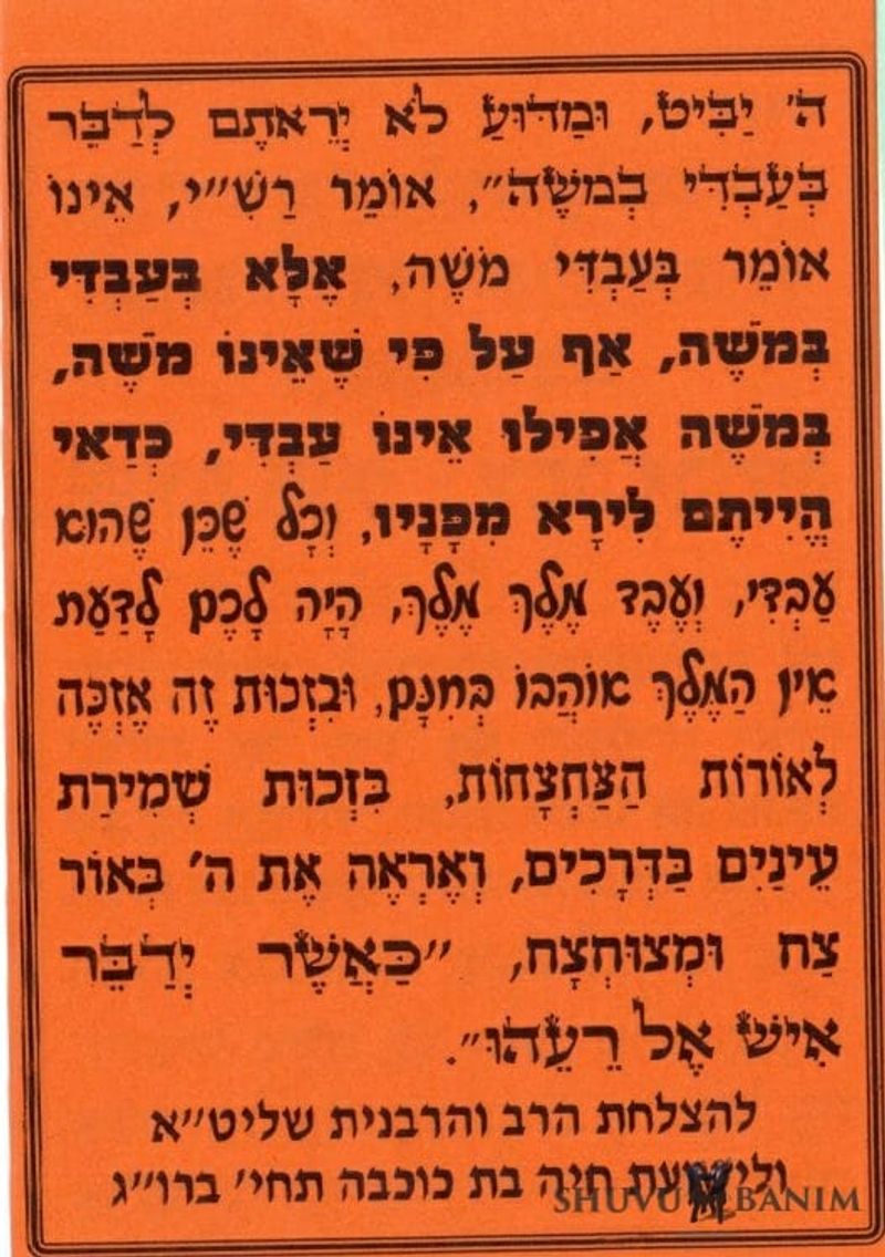 And in the merit of this, may I merit the level of Moshe: âAnd the man Moshe was more humble than any person on the face of the earth, mouth-to-mouth I speak with him, in a vision and not in riddles. And at the image of Hashem does he gaze. Why did you not fear to speak about My servant, about Moshe?â And Rashi says, it doesnât say âMy servant Mosheâ, rather âabout My servant, about Mosheâ. Even if he was not [as righteous as Moshe, or] about [one as righteous as] Moshe, even if he were not âMy servantâ, it would have been appropriate for you to fear him. And all the more so, that he is My servant, and the servant of a King is a king. You should have known that the King doesnât love him for nothing. And in the merit of this, may I merit to have the pure lights, in the merit of guarding my eyes when I walk on the way.And may I see Hashem with the purest of pure light: âLike a person speaks to his friend.â