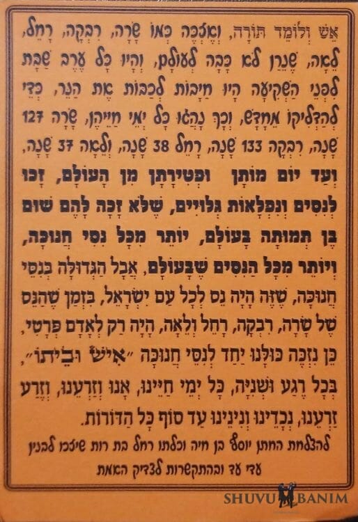 Master of the world who can do anything, from whom nothing is withheld, may I merit in preparing to light the Hanukah candle, āeach man and his householdā, may I merit to ignite the fire of Hanukah in my heart.And all my 248 limbs and 365 sinews will turn into fiery flames, flame x2 = 248.And may I merit to be like our forefather Avraham, whose entire 248 limbs and 365 sinews turned into fiery flames, and flames of fire, like Devorah the wife of Lapidot, whose entire body, her 248 limbs and her 365 sinews, turned into fiery flames and like Rabbi Zeira, who each 30 days would sit in a bonfire of fire and learn Torah. And may I merit like Sarah, Rivka, Rachel and Leah, whose candles never went out ever, and every erev Shabbat before dusk they would need to extinguish their candles, in order to light them anew. And thatās how they acted all the days of their lives, Sarah 127 years, Rivka 133 years, Rachel 38 years, and Leah 45 years, and until the day of their death and passing from this world, merited revealed wonders and miracles, that no pure child in the world has merited, more than all the miracles of Hanukah, and more than all the miracles in the world. But the greatness of the miracles of Hanukah is that is was a miracle for all Am Yisrael, whereas the miracle for Sarah, Rachel, Rivka and Leah were only for a private individual.