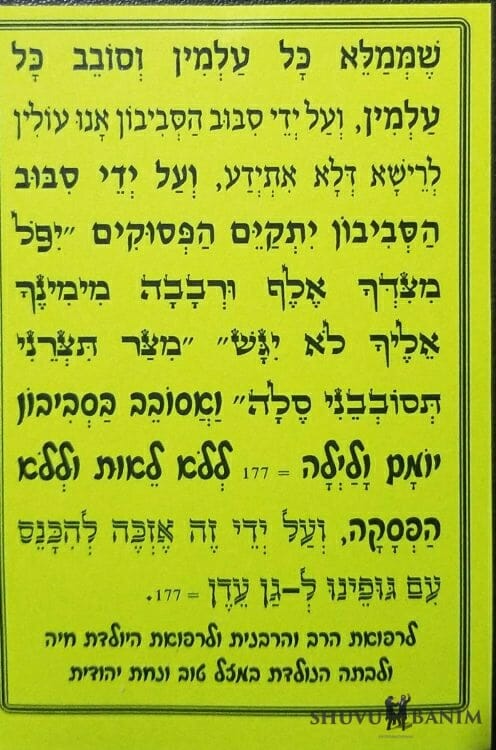 Master of the world who can do anything, the secret of the dreidel fills all the worlds and surrounds all the worlds. Grant me the merit all eight days of Hanukah to spin with the dreidel and to sanctify time and understanding of the heart in the spinning of the dreidel that fills all the worlds and surrounds all the worlds. And through the spin of the dreidel we rise up to the reisha d’lo ityada (the head which is unknown). And through the spin of the dreidel may the verses be fulfilled, “there will fall from your side a thousand, and a multitude from your right, to you they will not approach”, “from sorrow save me, surround me, Selah”. And I will spin with the dreidel day and night = 177 without rest and without pause and through this may we merit to enter with our bodies into Gan Eden = 177.====