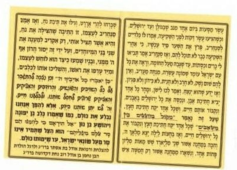 In the merit of the prayer and the Torah that King Hezkiyahu introduced into Am Yisrael, they merited to beat the 200,000 myriads, plus 600 soldiers of Sancheriv, who were two billion and 600,000 soldiers, minus one, who crossed the Jordan. And there didnât remain even a drop of water in the Jordan, and they did 10 voyages in one day, from Nov in the Golan, until Jerualem. And when they got there, 10 minutes before shkia (halachic twilight), the Chaldeans said to Sancheriv, breach the gate immediately, now! Because after shkia, you already wonât be able to do it. And Sancheriv said, bring me pillows and featherbeds. When he looked over the wall, and saw all of Am Yisrael standing and praying the Shemoneh Esrei, minchah and maâariv, and they didnât have any weapons, not a sword and not a spear, not a lance and not a dagger â and then he understood that he would win. So he said go to sleep, and tomorrow every person will bring a bit of stone, and we will enter all of Jerusalem with stones, and bury them alive. And that every person should take a bit of wood, which about this itâs said: âRather than the sound of the arrows aimed at the water drawers.âThat each person would take a piece of wood, and bury the whole of Jerusalem alive.