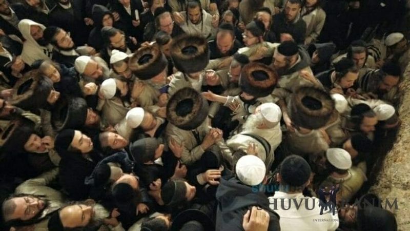 At 1:56 am, the Rav shlit"a left his home for the direction of the Kotel (Western Wall), with hundreds of members of our community escorting him. At 2:10, he arrived at the Kotel, and after kissing the holy stones of the Kotel, he began saying the first of eight Tikkun HaKlali's in a row along with the community with holy fire for over an hour and a half, for the salvation of the Jewish people, while at exactly that time, terrorists began launching missiles at Sderot and the areas around Gaza. After the Tikkun HaKlali's the Rav concluded with Kaddish with niggunim along with the community, which in the meantime was joined also by people from outside Jerusalem. After Kaddish, the Rav shlit"a prayed for the Jewish people while kissing the walls of the Kotel. He left with the song, "Ura Kevodi..." At 3:50, the Rav returned to his home to continue the Avodah of the holy days, and the Shacharit prayer, Hallel, and Musaf. Photos courtesy of "Keren HaTzaddik -- Netzach Netzachim"