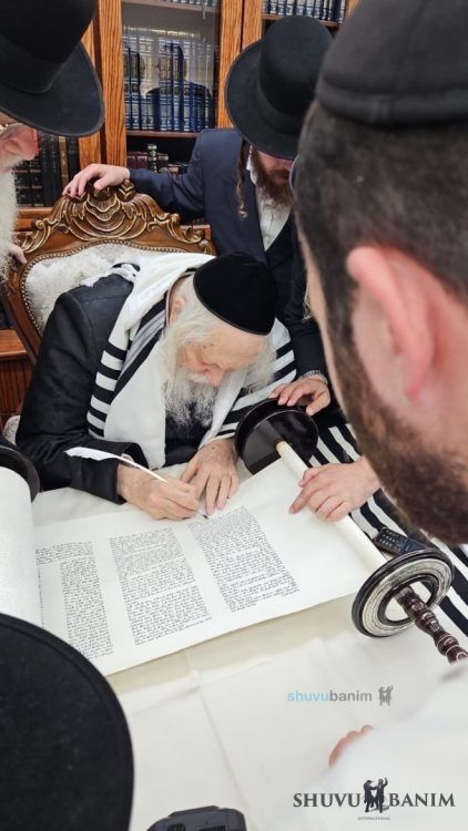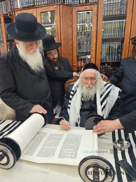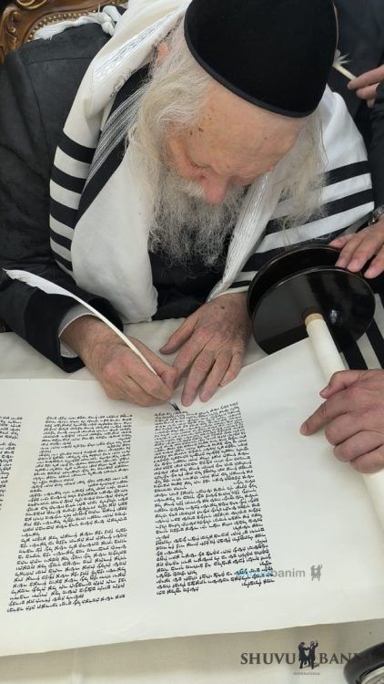 The day before the dedication of the Torah scroll, as mentioned, an event for writing the last letters was held at the home of Moreinu HaRav shlit"a. Present at the event were R’ Gavriel Grossman shlit"a and his son-in-law R’ Motta Frank shlit"a. During the event, Moreinu HaRav shlit"a spoke, mentioning the departed in whose names and memory the Torah scroll was dedicated, and also relating “stories from ancient times.”
