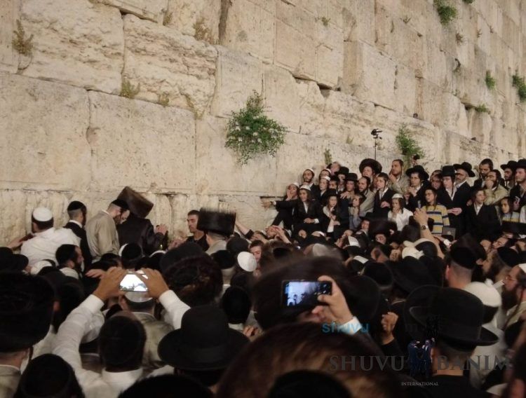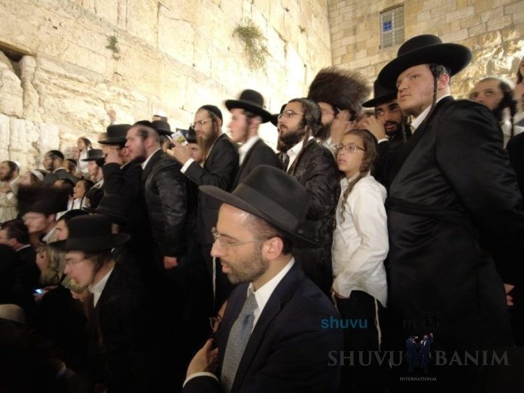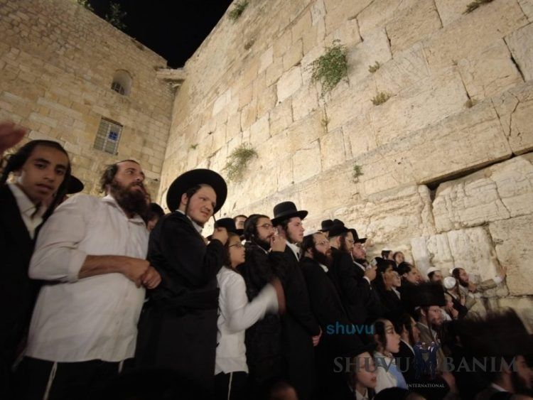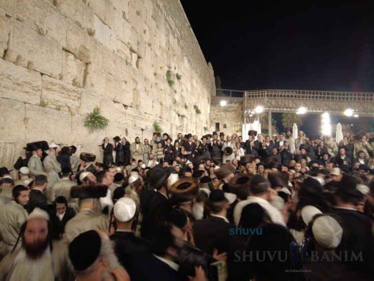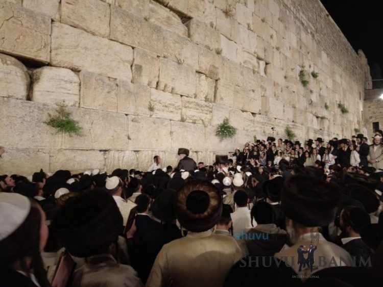 About two and a half hours after completing Melavah Malkah, at 12:45 am, Moreinu HaRav shlitâa appeared at the Kotel plaza. The thousands who came from all over Israel were already waiting near the Kotel, welcoming him with the song âOr Zarua LaTzaddik.â It is worth noting that immediately upon stepping out of his car at the entrance to the menâs section, Moreinu HaRav spotted the moon and recited Kiddush Levanah. Due to the intense crowding around him, he did not prolong it in his usual holy manner. Afterwards, he approached the remnant of our Holy Temple â the Kotel, from which the Shechinah (Divine Presence) has never departed. He ascended the special platform that was prepared for him so that everyone gathered could behold his holy presence during this uplifting event. For close to an hour, Moreinu HaRav shlitâa said Tikkun HaKlaliâs, one after the next, with melody and pleasantness. Amid the fervor of the exalted event, Moreinu HaRav shlitâa kissed the holy stones of the Kotel again and again, his crystal-clear eyes lifting up silent prayers for the Am Yisrael, who are found in distress and captivity. At the conclusion of five Tikkun HaKlaliâs, Moreinu HaRav said Kaddish with a niggun and departed from the Kotel, accompanied by hundreds of people from our community singing âOr Zarua LaTzaddik.âFortunate are we that we merited!!